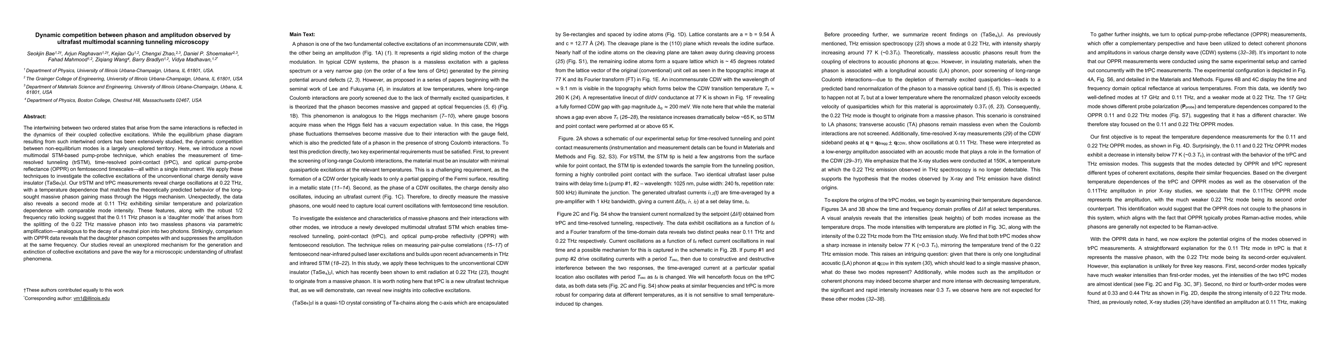 The intertwining between two ordered states that arise from the same interactions is reflected in the dynamics of their coupled collective excitations. While the equilibrium phase diagram resulting from such intertwined orders has been extensively studied, the dynamic competition between non-equilibrium modes is a largely unexplored territory. Here, we introduce a novel multimodal STM-based pump-probe technique, which enables the measurement of time-resolved tunneling (trSTM), time-resolved point-contact (trPC), and optical pump-probe reflectance (OPPR) on femtosecond timescales-all within a single instrument. We apply these techniques to investigate the collective excitations of the unconventional charge density wave insulator (TaSe4)2I. Our trSTM and trPC measurements reveal charge oscillations at 0.22 THz, with a temperature dependence that matches the theoretically predicted behavior of the long-sought massive phason gaining mass through the Higgs mechanism. Unexpectedly, the data also reveals a second mode at 0.11 THz exhibiting similar temperature and polarization dependence with comparable mode intensity. These features, along with the robust 1/2 frequency ratio locking suggest that the 0.11 THz phason is a 'daughter mode' that arises from the splitting of the 0.22 THz massive phason into two massless phasons via parametric amplification-analogous to the decay of a neutral pion into two photons. Strikingly, comparison with OPPR data reveals that the daughter phason competes with and suppresses the amplitudon at the same frequency. Our studies reveal an unexplored mechanism for the generation and extinction of collective excitations and pave the way for a microscopic understanding of ultrafast phenomena.