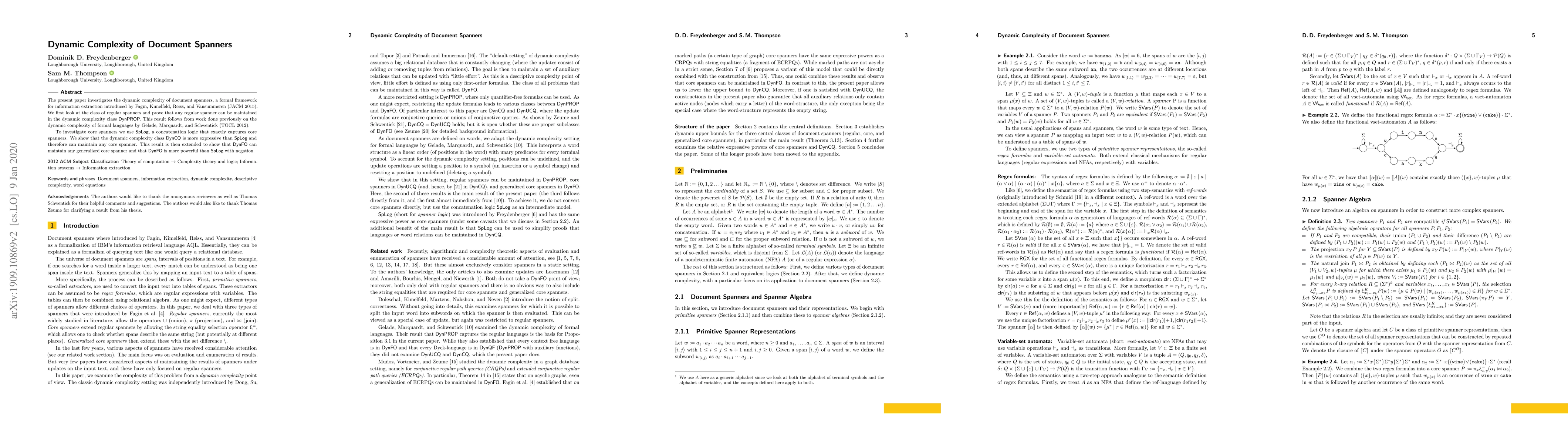 This paper explores the dynamic complexity of document spanners, proving that regular spanners can be maintained in the DynPROP class, leveraging prior results on dynamic complexity of formal languages. It further demonstrates that DynCQ can maintain any core spanner using SpLog, and extends this to show that DynFO can maintain generalized core spanners, establishing DynFO's superiority over SpLog with negation.