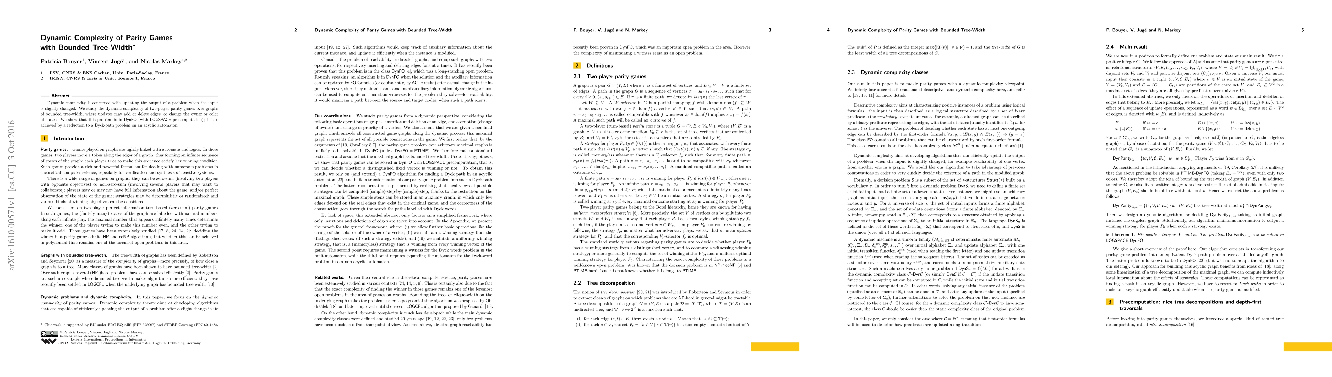 The paper investigates the dynamic complexity of updating two-player parity games on graphs with bounded tree-width when edges or state properties change. It demonstrates that such updates can be handled efficiently in DynFO with LOGSPACE precomputation, via a reduction to a Dyck-path problem on an acyclic automaton.