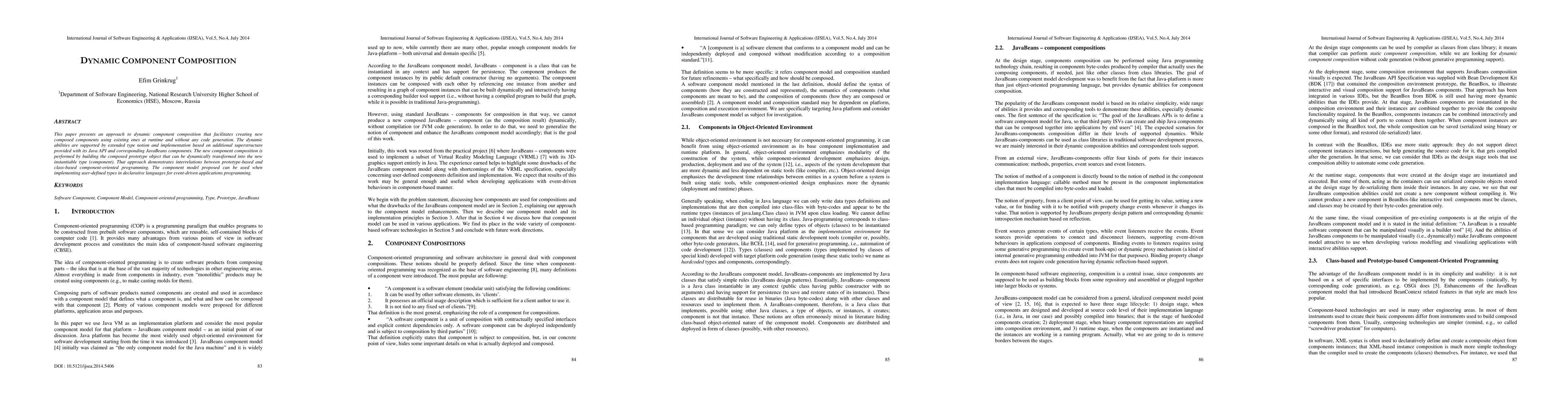 This paper presents an approach to dynamic component composition that facilitates creating new composed components using existing ones at runtime and without any code generation. The dynamic abilities are supported by extended type notion and implementation based on additional superstructure provided with its Java API and corresponding JavaBeans components. The new component composition is performed by building the composed prototype object that can be dynamically transformed into the new instantiable type (component). That approach demonstrates interrelations between prototype-based and class-based component-oriented programming. The component model proposed can be used when implementing user-defined types in declarative languages for event-driven applications programming.