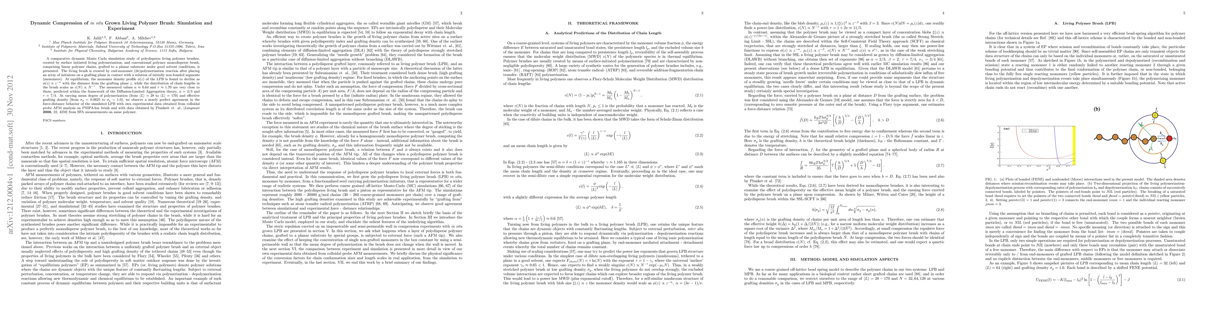 A comparative dynamic Monte Carlo simulation study of polydisperse living polymer brushes, created by surface initiated living polymerization, and conventional polymer monodisperse brush, comprising linear polymer chains, grafted to a planar substrate under good solvent conditions, is presented. The living brush is created by end-monomer (de)polymerization reaction after placing an array of initiators on a grafting plane in contact with a solution of initially non-bonded segments (monomers). At equilibrium, the monomer density profile \phi(z) of the LPB is found to decline as \phi(z) ~ z^{-\alpha} with the distance from the grafting plane z, while the distribution of chain lengths in the brush scales as c(N) ~ N^{-\tau}. The measured values \alpha = 0.64 and \tau = 1.70 are very close to those, predicted within the framework of the Diffusion-Limited Aggregation theory, \alpha = 2/3 and \tau = 7/4. At varying mean degree of polymerization (from L = 28 to L = 170) and effective grafting density (from \sigma_g = 0.0625 to \sigma_g = 1.0), we observe a nearly perfect agreement in the force-distance behavior of the simulated LPB with own experimental data obtained from colloidal probe AFM analysis on PNIPAAm brush and with data obtained by Plunkett et. al., [Langmuir 2006, 22, 4259] from SFA measurements on same polymer.