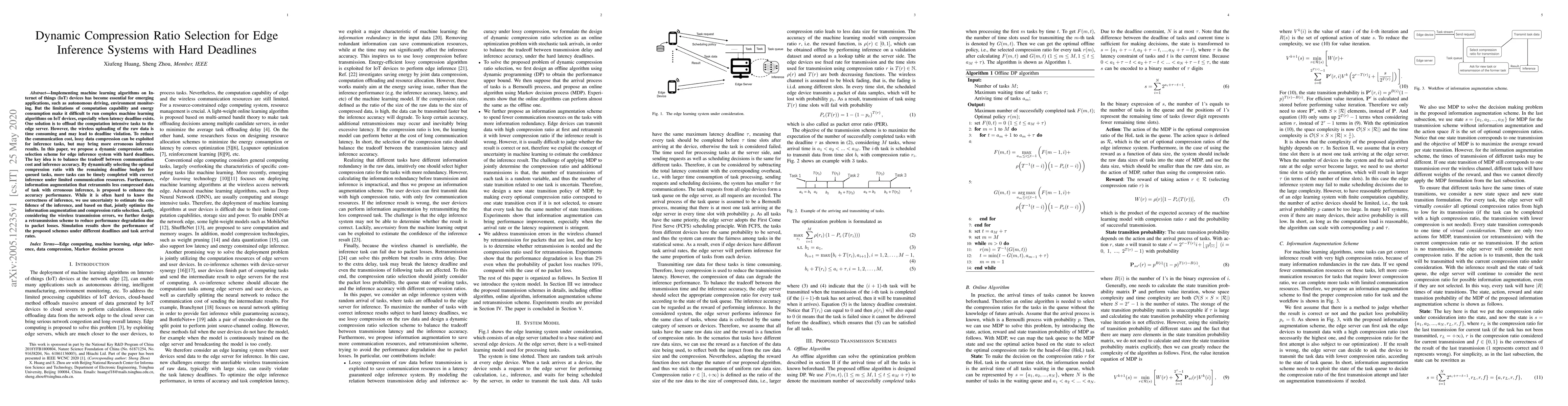 Implementing machine learning algorithms on Internet of things (IoT) devices has become essential for emerging applications, such as autonomous driving, environment monitoring. But the limitations of computation capability and energy consumption make it difficult to run complex machine learning algorithms on IoT devices, especially when latency deadline exists. One solution is to offload the computation intensive tasks to the edge server. However, the wireless uploading of the raw data is time consuming and may lead to deadline violation. To reduce the communication cost, lossy data compression can be exploited for inference tasks, but may bring more erroneous inference results. In this paper, we propose a dynamic compression ratio selection scheme for edge inference system with hard deadlines. The key idea is to balance the tradeoff between communication cost and inference accuracy. By dynamically selecting the optimal compression ratio with the remaining deadline budgets for queued tasks, more tasks can be timely completed with correct inference under limited communication resources. Furthermore, information augmentation that retransmits less compressed data of task with erroneous inference, is proposed to enhance the accuracy performance. While it is often hard to know the correctness of inference, we use uncertainty to estimate the confidence of the inference, and based on that, jointly optimize the information augmentation and compression ratio selection. Lastly, considering the wireless transmission errors, we further design a retransmission scheme to reduce performance degradation due to packet losses. Simulation results show the performance of the proposed schemes under different deadlines and task arrival rates.