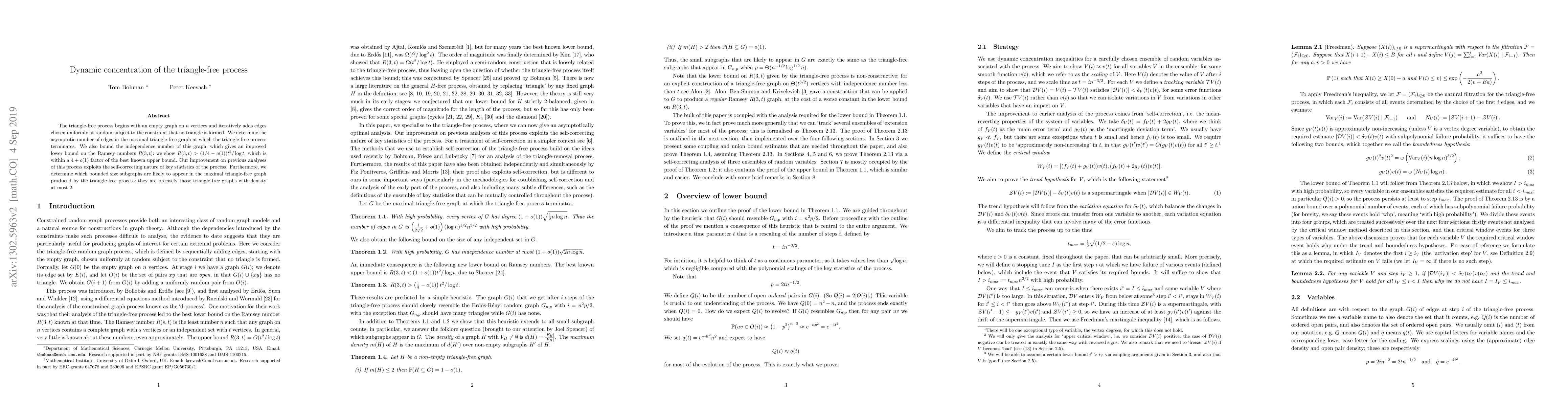 This paper investigates the triangle-free process, determining the asymptotic number of edges in the maximal triangle-free graph and improving the lower bound on Ramsey numbers R(3,t) to R(3,t) > (1-o(1)) t^2 / (4 log t). The study leverages the self-correcting properties of key statistics and identifies the likely bounded size subgraphs in the maximal triangle-free graph.