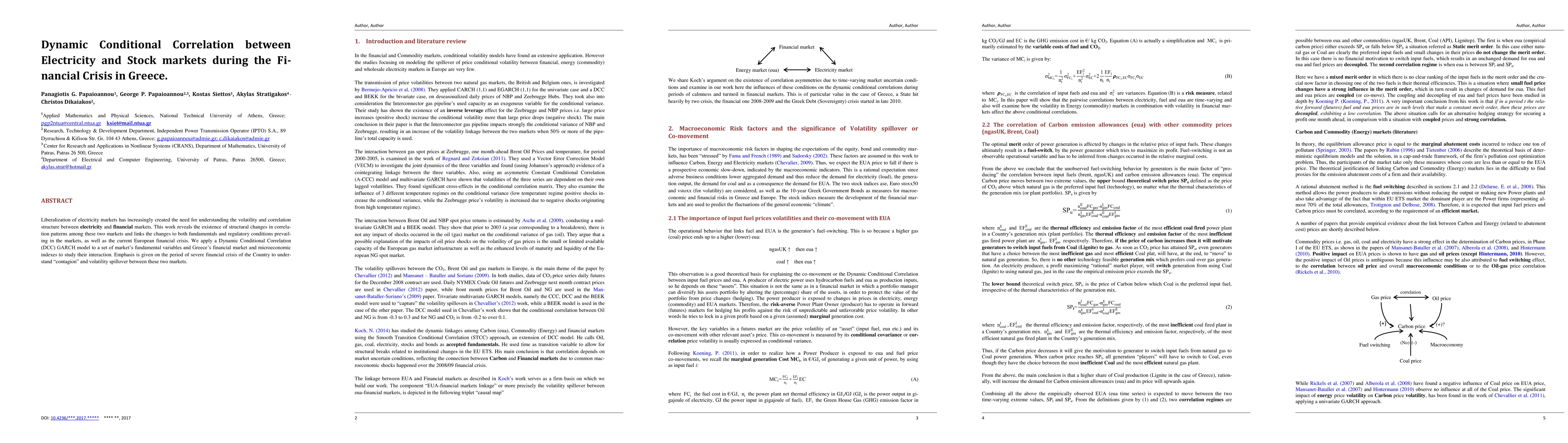 Liberalization of electricity markets has increasingly created the need for understanding the volatility and correlation structure between electricity and financial markets. This work reveals the existence of structural changes in correlation patterns among these two markets and links the changes to both fundamentals and regulatory conditions prevailing in the markets, as well as the current European financial crisis. We apply a Dynamic Conditional Correlation (DCC) GARCH model to a set of market s fundamental variables and Greece s financial market and microeconomic indexes to study their interaction. Emphasis is given on the period of severe financial crisis of the Country to understand contagion and volatility spillover between these two markets.