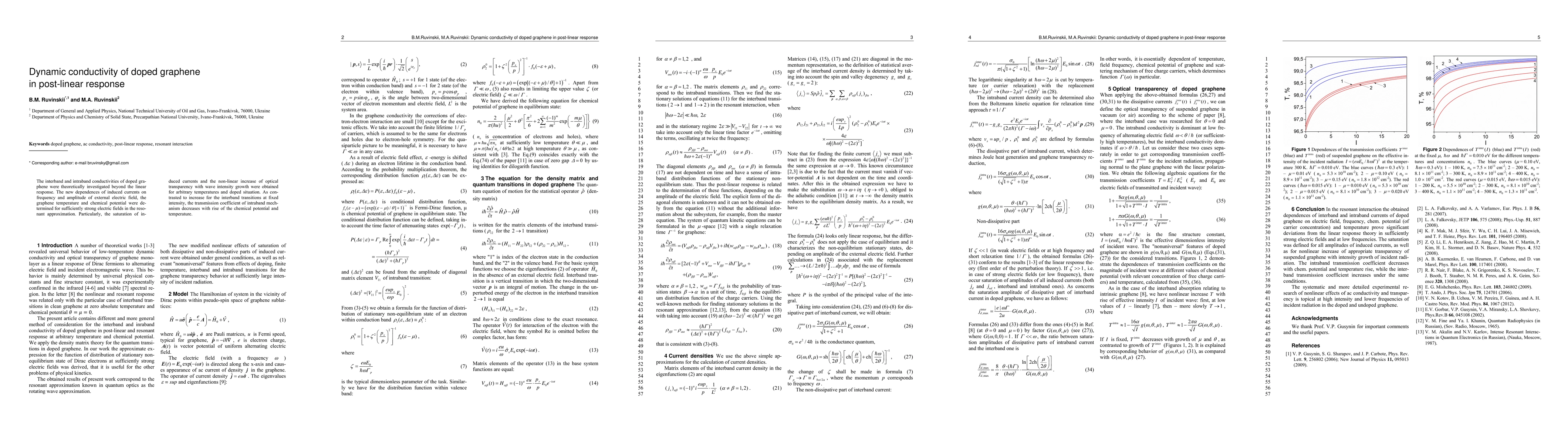 The study investigates the dynamic conductivity of doped graphene beyond linear response, revealing new dependencies on frequency, field amplitude, temperature, and chemical potential for strong fields. It shows saturation of induced currents and a non-linear increase in optical transparency with wave intensity, while intraband transmission decreases with rising chemical potential and temperature.