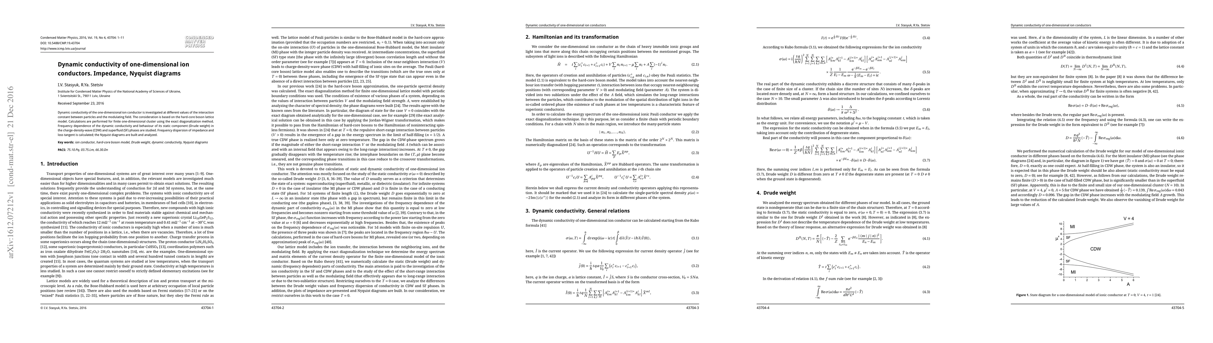 Dynamic conductivity of the one-dimensional ion conductor is investigated at different values of the interaction constant between particles and the modulating field. The consideration is based on the hard-core boson lattice model. Calculations are performed for finite one-dimensional cluster using the exact diagonalization method. Frequency dependence of the dynamic conductivity and behaviour of its static component (Drude weight) in the charge-density-wave (CDW) and superfluid (SF) phases are studied. Frequency dispersion of impedance and loss tangent is calculated; the Nyquist diagrams are built and analyzed.