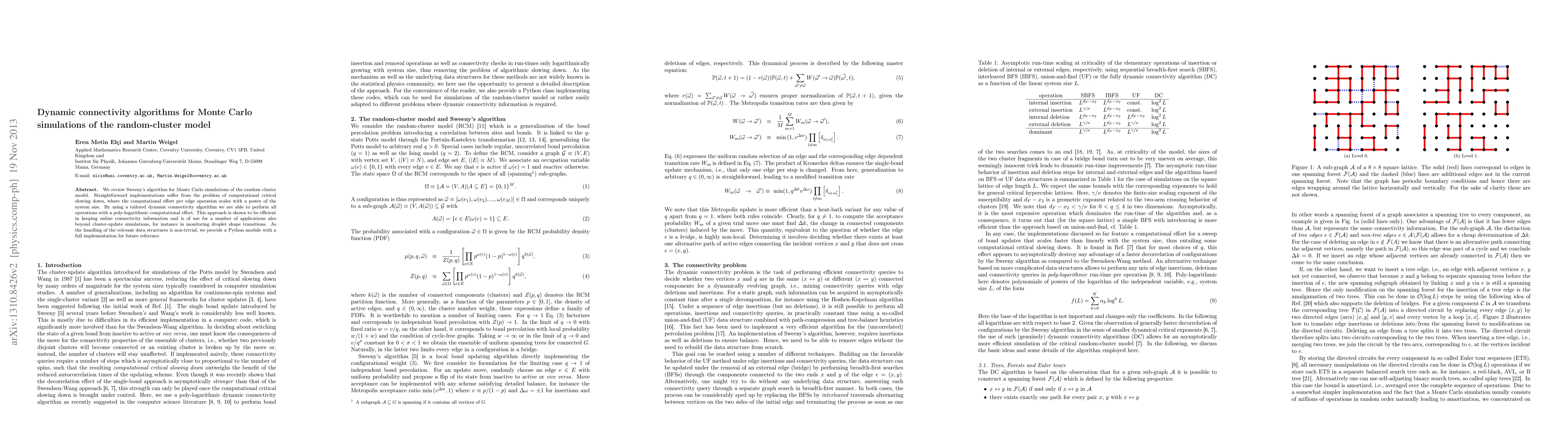 We review Sweeny's algorithm for Monte Carlo simulations of the random cluster model. Straightforward implementations suffer from the problem of computational critical slowing down, where the computational effort per edge operation scales with a power of the system size. By using a tailored dynamic connectivity algorithm we are able to perform all operations with a poly-logarithmic computational effort. This approach is shown to be efficient in keeping online connectivity information and is of use for a number of applications also beyond cluster-update simulations, for instance in monitoring droplet shape transitions. As the handling of the relevant data structures is non-trivial, we provide a Python module with a full implementation for future reference.