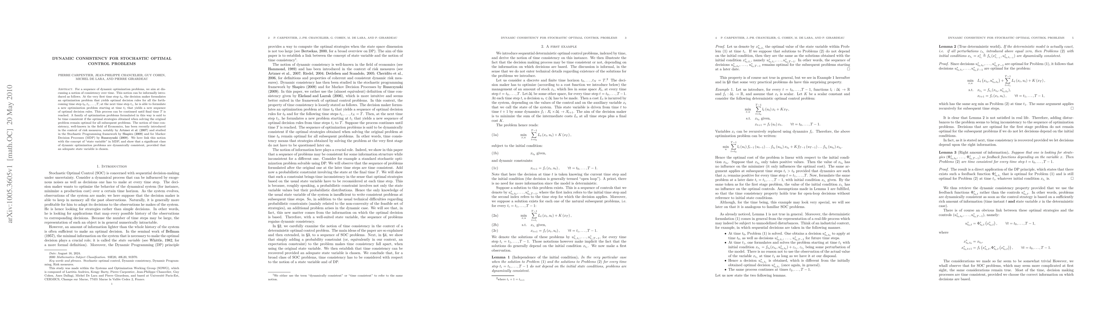 For a sequence of dynamic optimization problems, we aim at discussing a notion of consistency over time. This notion can be informally introduced as follows. At the very first time step $t_0$, the decision maker formulates an optimization problem that yields optimal decision rules for all the forthcoming time step $t_0, t_1, ..., T$; at the next time step $t_1$, he is able to formulate a new optimization problem starting at time $t_1$ that yields a new sequence of optimal decision rules. This process can be continued until final time $T$ is reached. A family of optimization problems formulated in this way is said to be time consistent if the optimal strategies obtained when solving the original problem remain optimal for all subsequent problems. The notion of time consistency, well-known in the field of Economics, has been recently introduced in the context of risk measures, notably by Artzner et al. (2007) and studied in the Stochastic Programming framework by Shapiro (2009) and for Markov Decision Processes (MDP) by Ruszczynski (2009). We here link this notion with the concept of "state variable" in MDP, and show that a significant class of dynamic optimization problems are dynamically consistent, provided that an adequate state variable is chosen.