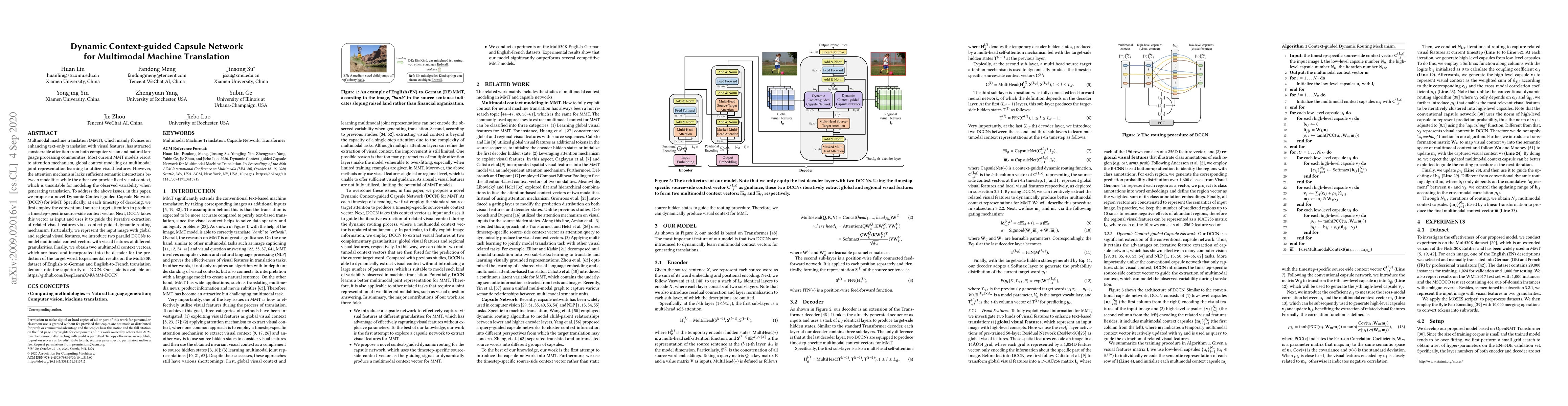 A novel Dynamic Context-guided Capsule Network (DCCN) for multimodal machine translation improves on existing models by incorporating context-guided dynamic routing to adapt to variability during translation, achieving superior results in English-to-German and English-to-French translation experiments.