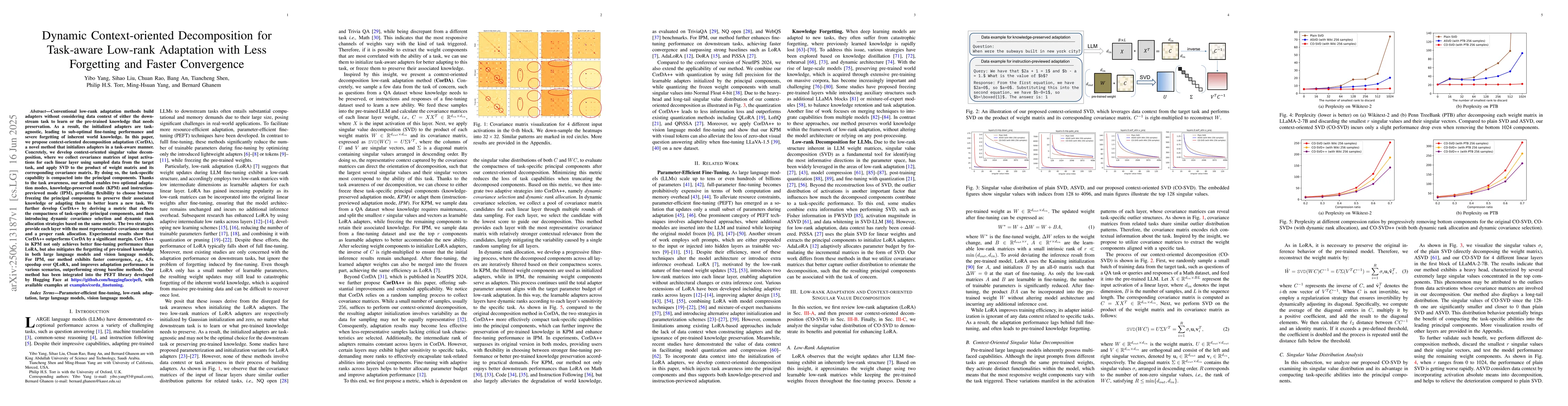 The paper introduces Context-oriented Decomposition Adaptation (CorDA) for task-aware low-rank adaptation, addressing suboptimal fine-tuning and knowledge forgetting in conventional methods. CorDA++ enhances this with dynamic covariance selection and rank allocation strategies, demonstrating superior performance over existing methods in fine-tuning and convergence across large language and vision language models.