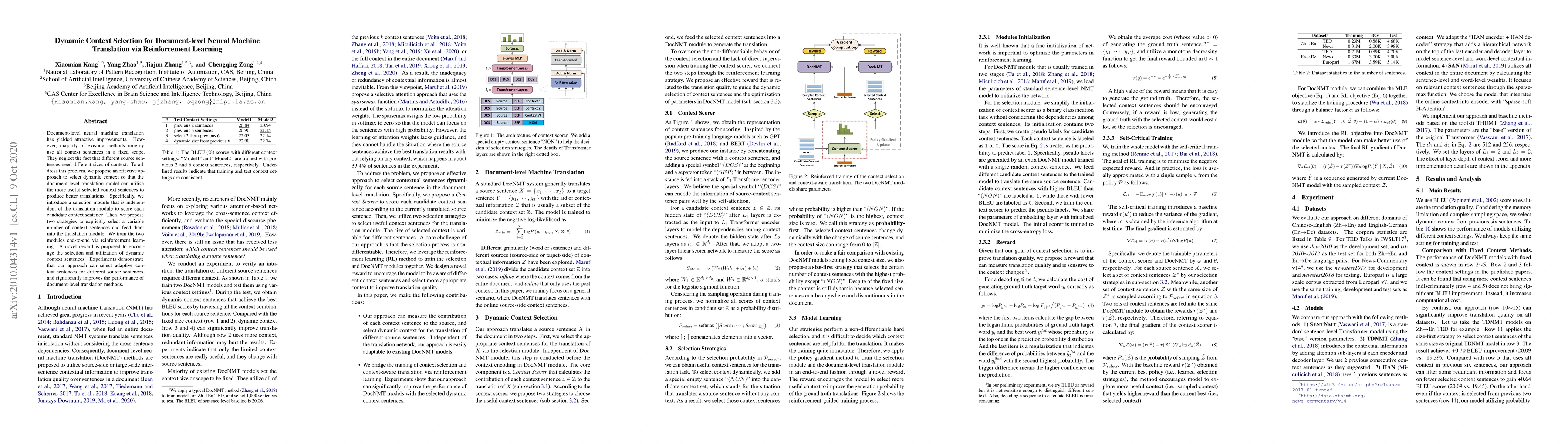 This paper proposes a method for dynamic context selection in document-level neural machine translation using reinforcement learning. It introduces a selection module to choose variable context sentences that are more useful for translation, improving overall model performance.
