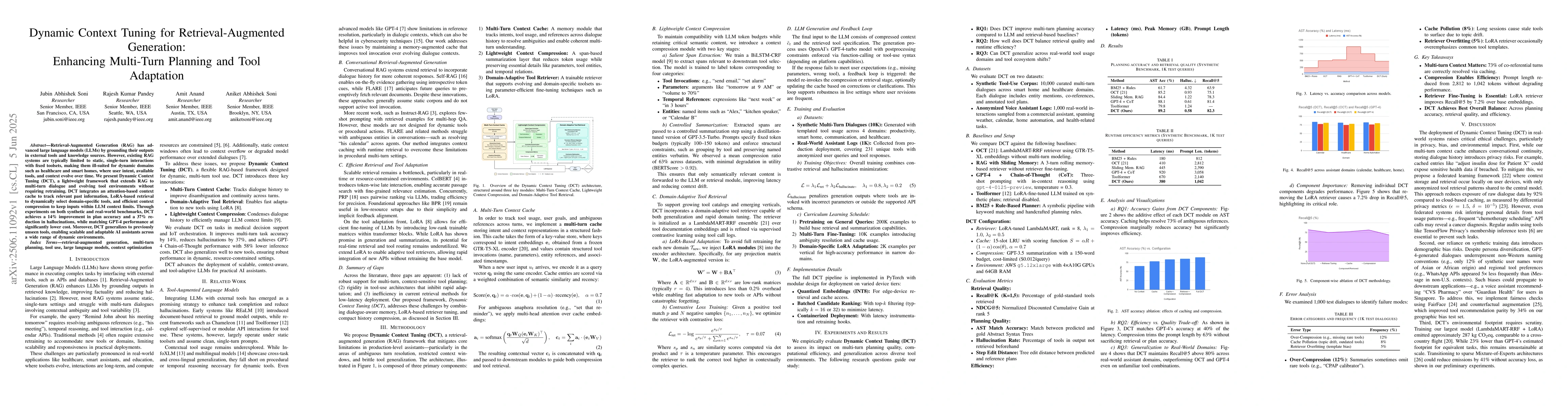 Retrieval-Augmented Generation (RAG) has significantly advanced large language models (LLMs) by grounding their outputs in external tools and knowledge sources. However, existing RAG systems are typically constrained to static, single-turn interactions with fixed toolsets, making them ill-suited for dynamic domains such as healthcare and smart homes, where user intent, available tools, and contextual factors evolve over time. We present Dynamic Context Tuning (DCT), a lightweight framework that extends RAG to support multi-turn dialogue and evolving tool environments without requiring retraining. DCT integrates an attention-based context cache to track relevant past information, LoRA-based retrieval to dynamically select domain-specific tools, and efficient context compression to maintain inputs within LLM context limits. Experiments on both synthetic and real-world benchmarks show that DCT improves plan accuracy by 14% and reduces hallucinations by 37%, while matching GPT-4 performance at significantly lower cost. Furthermore, DCT generalizes to previously unseen tools, enabling scalable and adaptable AI assistants across a wide range of dynamic environments.