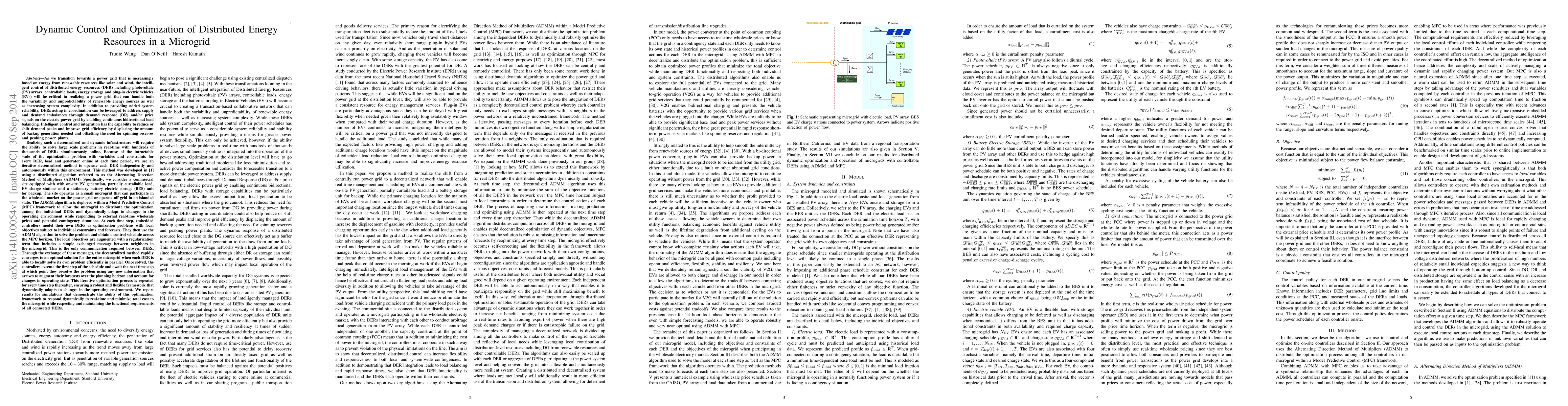 This paper presents an iterative distributed algorithm for dynamically controlling and optimizing distributed energy resources (DER) in a microgrid, including PV arrays, controllable loads, energy storage, and EVs. The algorithm enables real-time adaptation to changes in the operating environment, demonstrated through simulations on a commercial site with real data.