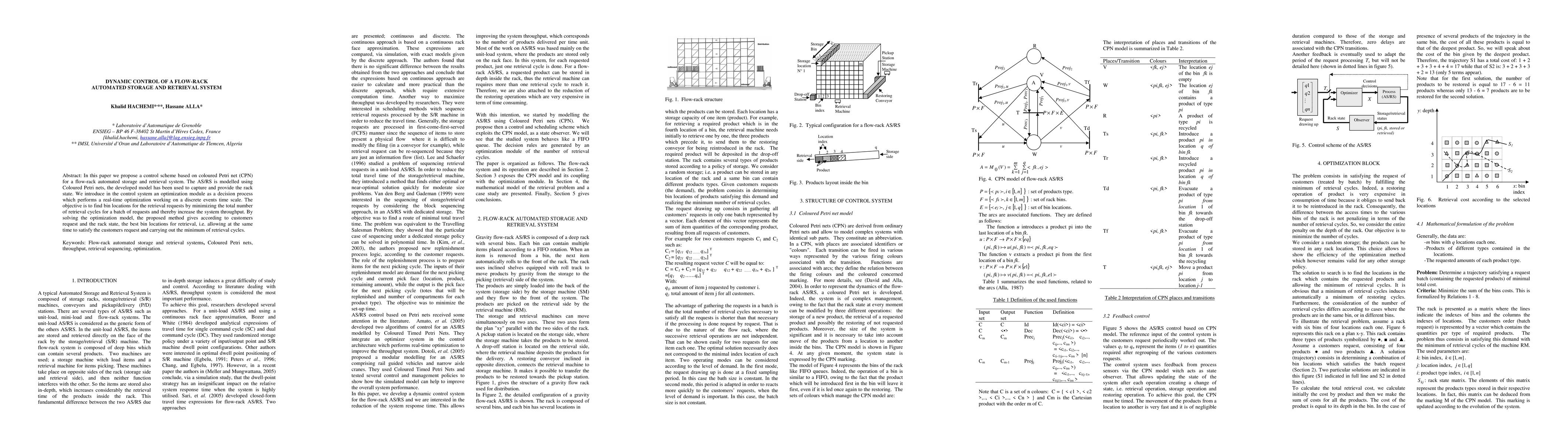In this paper we propose a control scheme based on coloured Petri net (CPN) for a flow-rack automated storage and retrieval system. The AS/RS is modelled using Coloured Petri nets, the developed model has been used to capture and provide the rack state. We introduce in the control system an optimization module as a decision process which performs a real-time optimization working on a discrete events time scale. The objective is to find bin locations for the retrieval requests by minimizing the total number of retrieval cycles for a batch of requests and thereby increase the system throughput. By solving the optimization model, the proposed method gives according to customers request and the rack state, the best bin locations for retrieval, i.e. allowing at the same time to satisfy the customers request and carrying out the minimum of retrieval cycles.