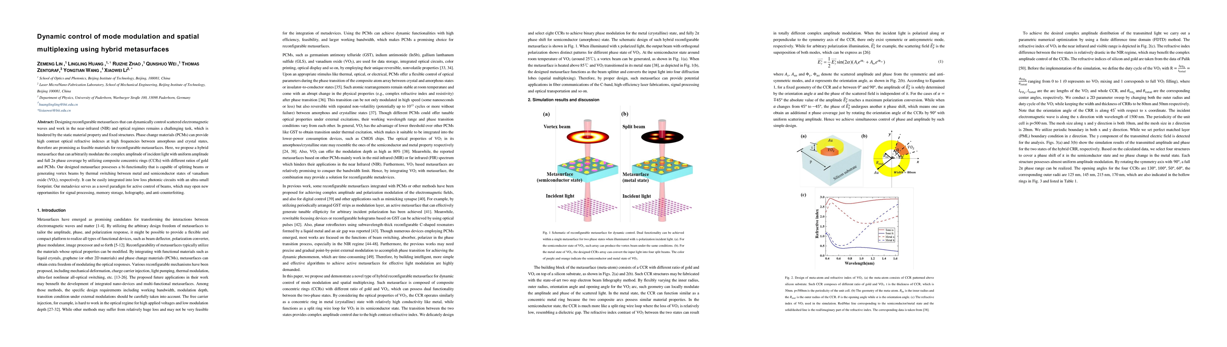 This paper proposes a hybrid metasurface using phase change materials to dynamically control electromagnetic wave scattering in the NIR and optical regimes. The metasurface, composed of composite concentric rings, enables full $2\pi$ phase modulation and uniform amplitude control, offering bi-functionality for beam splitting and vortex beam generation.