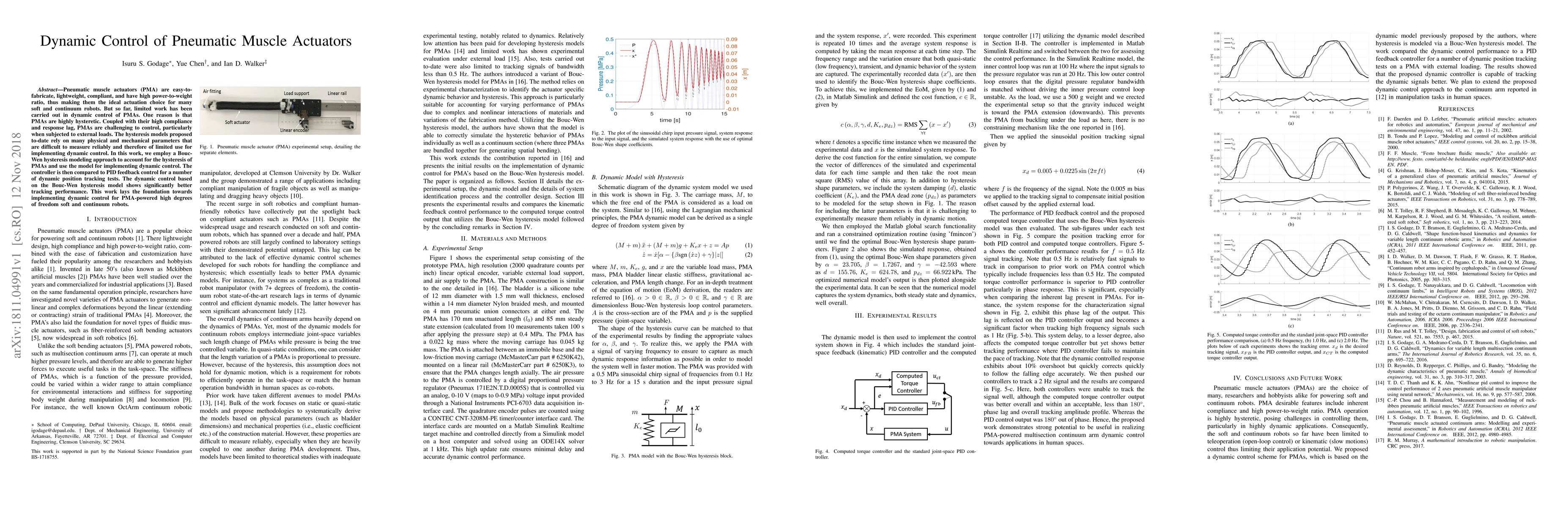 This paper develops a dynamic control strategy for pneumatic muscle actuators (PMAs) using a Bouc-Wen hysteresis model, which significantly improves position tracking performance compared to PID control, addressing the challenges posed by PMA's inherent hysteresis, compliance, and response lag.