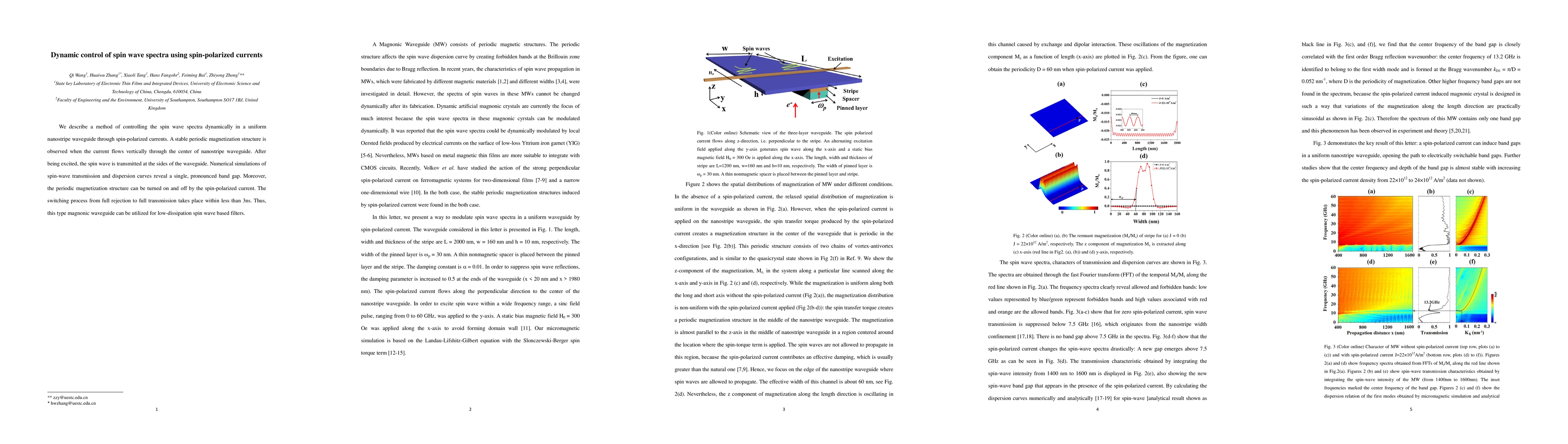 We describe a method of controlling the spin wave spectra dynamically in a uniform nanostripe waveguide through spin-polarized currents. A stable periodic magnetization structure is observed when the current flows vertically through the center of nanostripe waveguide. After being excited, the spin wave is transmitted at the sides of the waveguide. Numerical simulations of spin-wave transmission and dispersion curves reveal a single, pronounced band gap. Moreover, the periodic magnetization structure can be turned on and off by the spin-polarized current. The switching process from full rejection to full transmission takes place within less than 3ns. Thus, this type magnonic waveguide can be utilized for low-dissipation spin wave based filters.