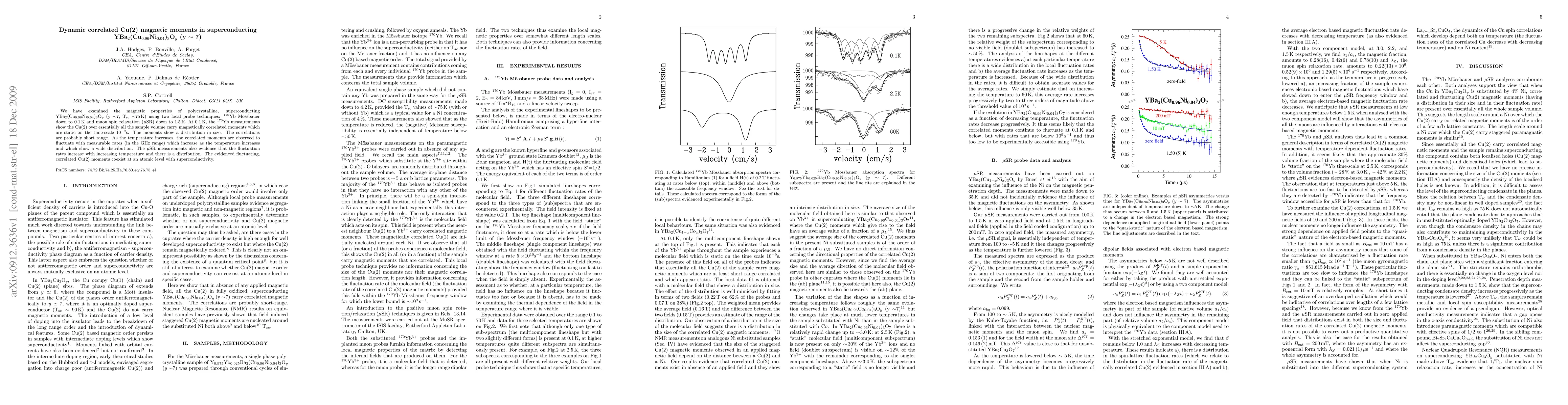 We have examined the magnetic properties of polycrystalline, superconducting YBa_2(Cu_0.96Ni_0.04)_3O_y (y ~ 7, T_sc ~ 75 K) using two local probe techniques: 170Yb Moessbauer down to 0.1 K and muon spin relaxation (muSR) down to 1.5 K. At 0.1 K, the 170Yb measurements show the Cu(2) over essentially all the sample volume carry magnetically correlated moments which are static on the time-scale of 10^{-9} s. The moments show a distribution in size. The correlations are probably short range. As the temperature increases, the correlated moments are observed to fluctuate with measurable rates (in the GHz range) which increase as the temperature increases and which show a wide distribution. The muSR measurements also evidence that the fluctuation rates increase with increasing temperature and there is a distribution. The evidenced fluctuating, correlated Cu(2) moments coexist at an atomic level with superconductivity.