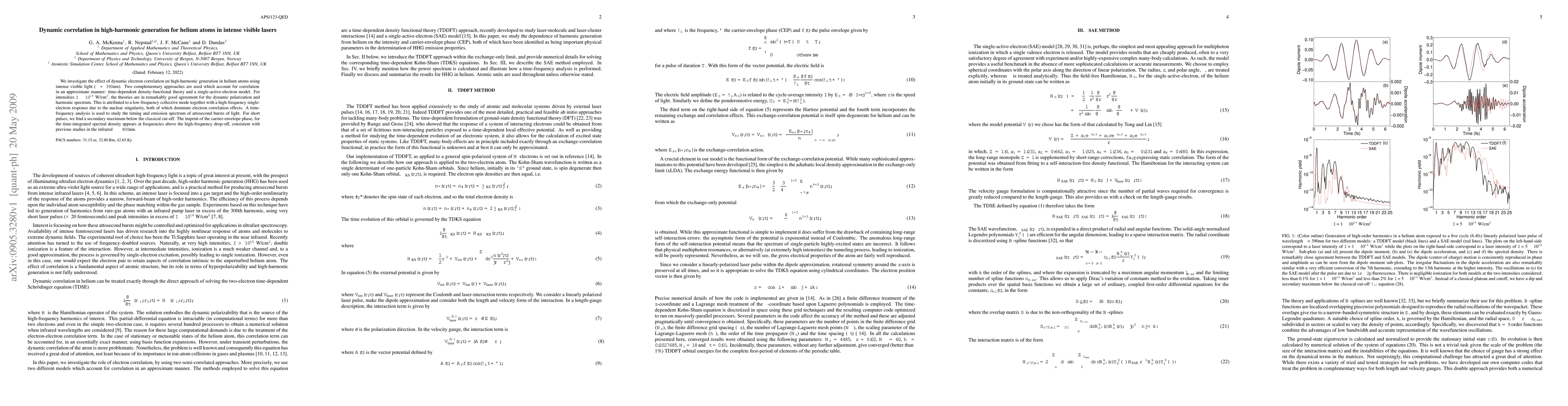 We investigate the effect of dynamic electron correlation on high-harmonic generation in helium atoms using intense visible light (\lambda=390nm). Two complementary approaches are used which account for correlation in an approximate manner: time-dependent density-functional theory and a single-active-electron model. For intensities I~10^{14} W/cm^2, the theories are in remarkably good agreement for the dynamic polarization and harmonic spectrum. This is attributed to a low-frequency collective mode together with a high-frequency single-electron response due to the nuclear singularity, both of which dominate electron correlation effects. A time-frequency analysis is used to study the timing and emission spectrum of attosecond bursts of light. For short pulses, we find a secondary maximum below the classical cut-off. The imprint of the carrier-envelope-phase, for the time-integrated spectral density appears at frequencies above the high-frequency drop-off, consistent with previous studies in the infrared \lambda~800nm.