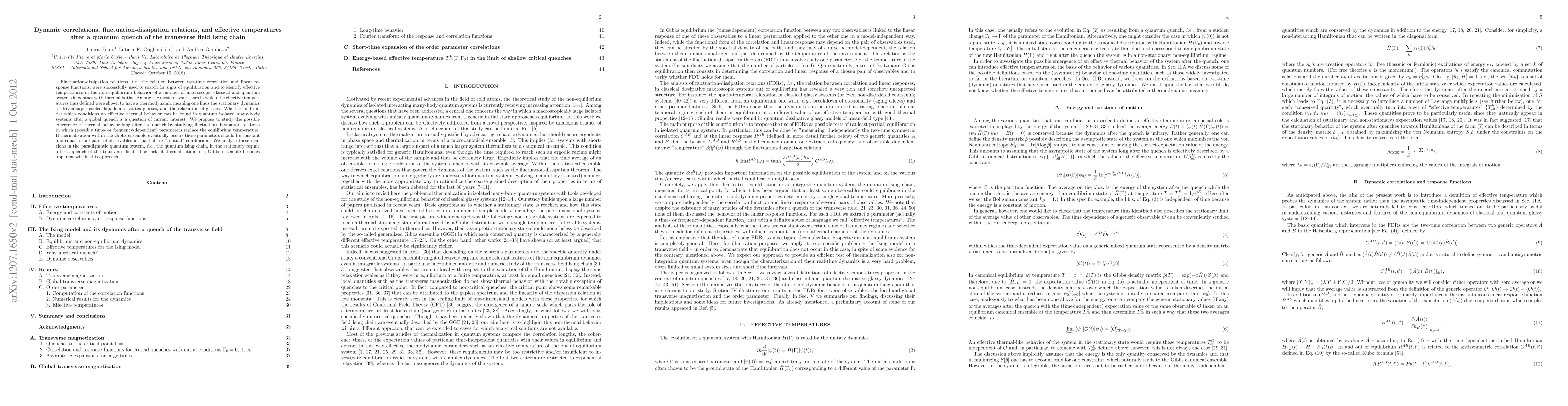 Fluctuation-dissipation relations, i.e., the relation between two-time correlation and linear response functions, were successfully used to search for signs of equilibration and to identify effective temperatures in the non-equilibrium behavior of a number of macroscopic classical and quantum systems in contact with thermal baths. Among the most relevant cases in which the effective temperatures thus defined were shown to have a thermodynamic meaning one finds the stationary dynamics of driven super-cooled liquids and vortex glasses, and the relaxation of glasses. Whether and under which conditions an effective thermal behavior can be found in quantum isolated many-body systems after a global quench is a question of current interest. We propose to study the possible emergence of thermal behavior long after the quench by studying fluctuation-dissipation relations in which (possibly time- or frequency-dependent) parameters replace the equilibrium temperature. If thermalization within the Gibbs ensemble eventually occurs these parameters should be constant and equal for all pairs of observables in "partial" or "mutual" equilibrium. We analyze these relations in the paradigmatic quantum system, i.e., the quantum Ising chain, in the stationary regime after a quench of the transverse field. The lack of thermalization to a Gibbs ensemble becomes apparent within this approach.