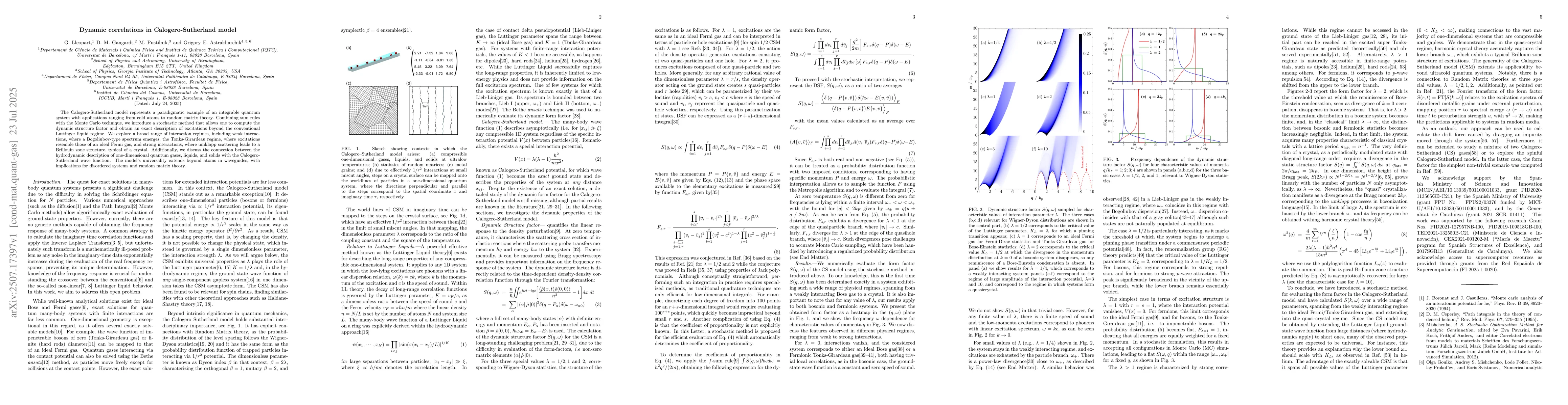 The Calogero-Sutherland model represents a paradigmatic example of an integrable quantum system with applications ranging from cold atoms to random matrix theory. Combining sum rules with the Monte Carlo technique, we introduce a stochastic method that allows one to compute the dynamic structure factor and obtain an exact description of excitations beyond the conventional Luttinger liquid regime. We explore a broad range of interaction regimes, including weak interactions, where a Bogoliubov-type spectrum emerges, the Tonks-Girardeau regime, where excitations resemble those of an ideal Fermi gas, and strong interactions, where umklapp scattering leads to a Brillouin zone structure, typical of a crystal. Additionally, we discuss the connection between the hydrodynamic description of one-dimensional quantum gases, liquids, and solids with the Calogero-Sutherland wave function. The model's universality extends beyond atoms in waveguides, with implications for disordered systems and random matrix theory.