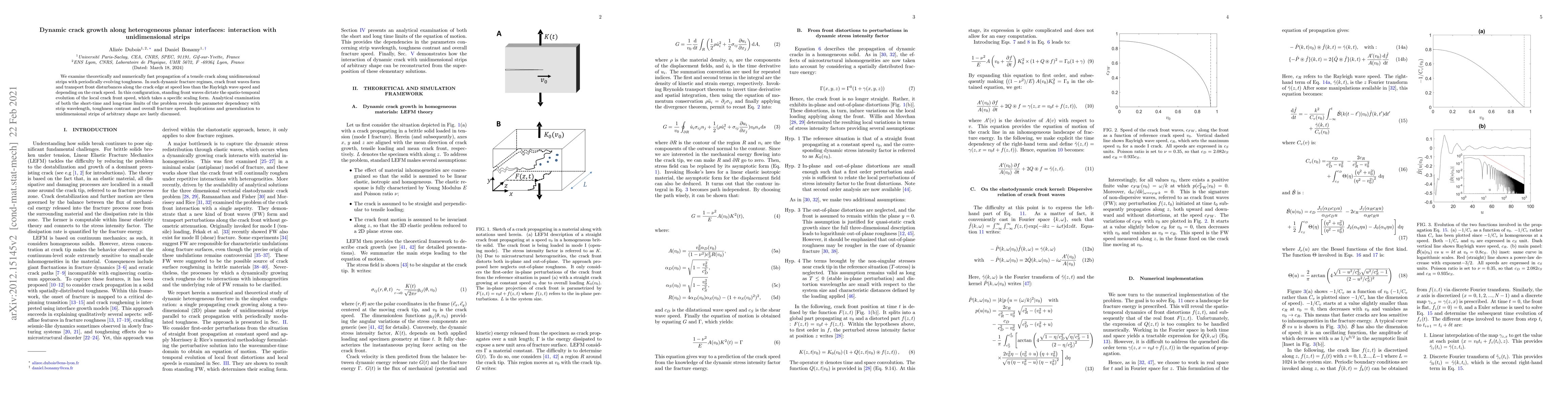 This research explores theoretically and numerically how cracks propagate rapidly along one-dimensional strips with varying toughness. It discovers that crack front waves form, affecting front disturbances at speeds slower than Rayleigh waves, with standing front waves controlling crack front speed's spatial-temporal evolution. The study examines short- and long-term limits, identifying dependencies on strip wavelength, toughness contrast, and fracture speed, and discusses implications for strips of arbitrary shapes.