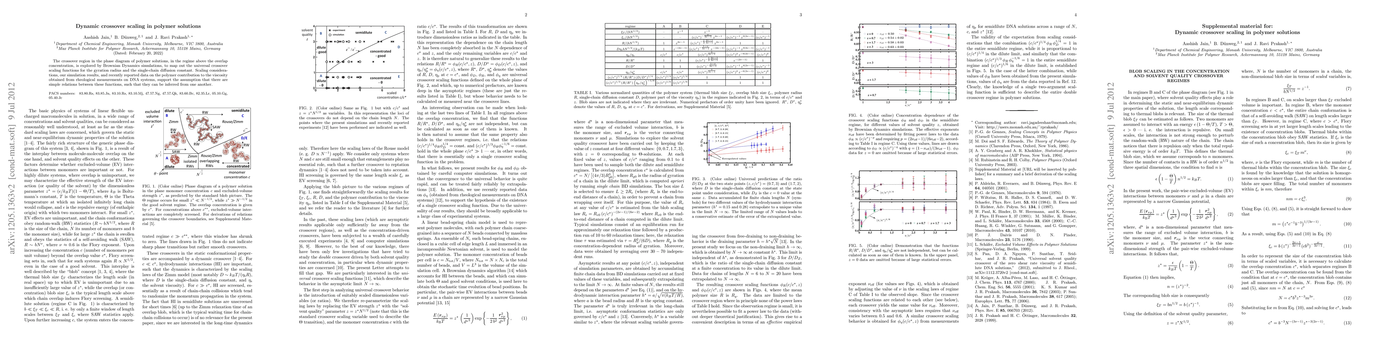 Brownian Dynamics simulations were employed to explore the crossover region in the phase diagram of polymer solutions, mapping out universal crossover scaling functions for gyration radius and single-chain diffusion constant.
