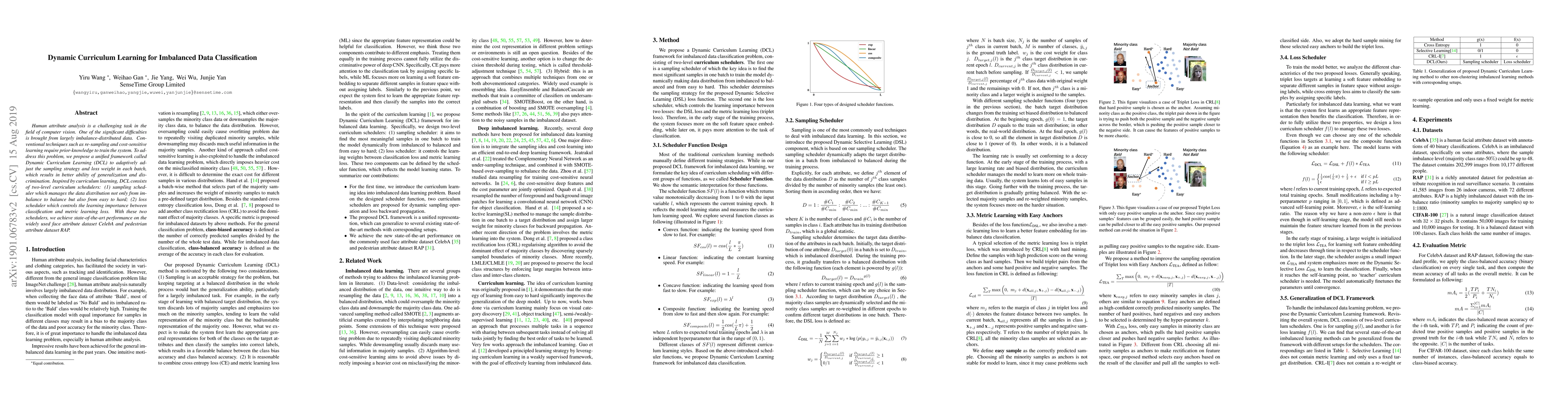 This paper proposes a Dynamic Curriculum Learning (DCL) framework for addressing imbalanced data classification in computer vision. DCL adaptively adjusts sampling and loss learning strategies, achieving better generalization and discrimination without requiring prior knowledge, demonstrated through state-of-the-art results on CelebA and RAP datasets.
