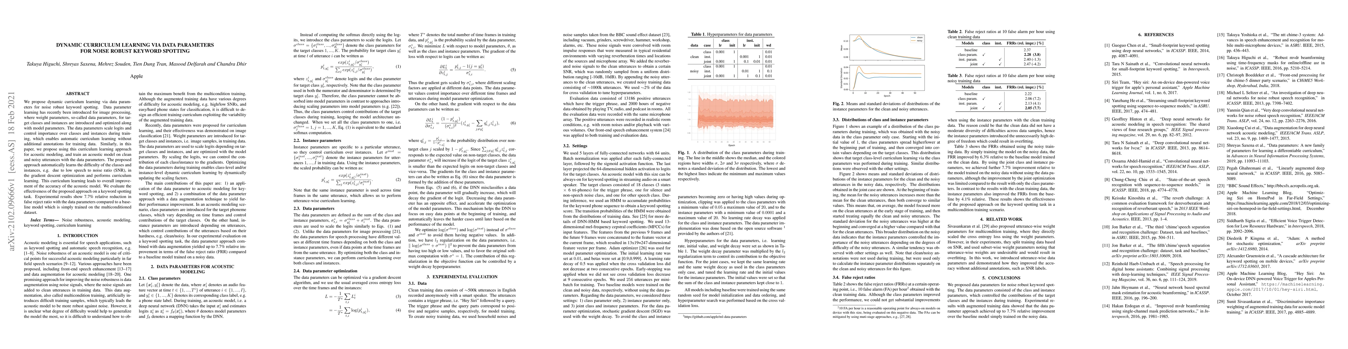 This paper proposes dynamic curriculum learning using data parameters for noise robust keyword spotting, where data parameters optimize class and instance importance during training, leading to a 7.7% relative reduction in false reject ratio compared to a baseline model. The approach enables automatic curriculum learning without additional annotations.