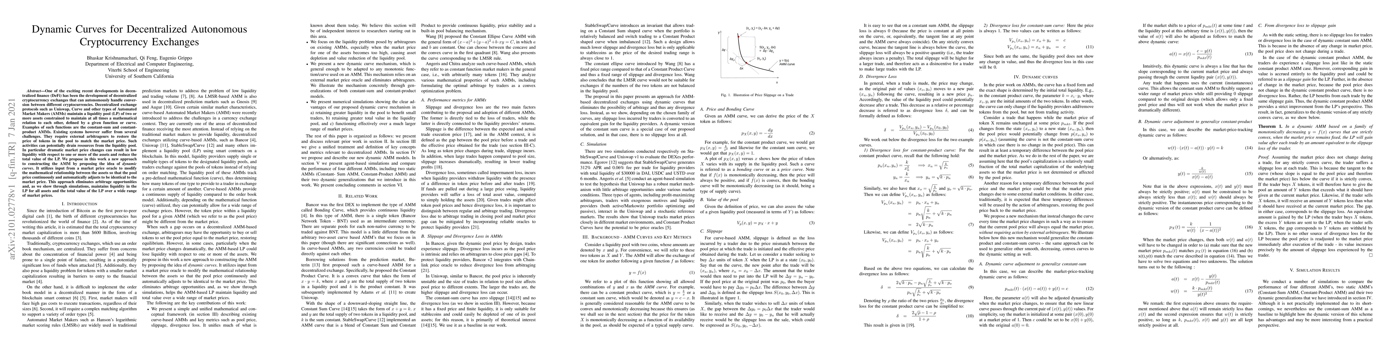 One of the exciting recent developments in decentralized finance (DeFi) has been the development of decentralized cryptocurrency exchanges that can autonomously handle conversion between different cryptocurrencies. Decentralized exchange protocols such as Uniswap, Curve and other types of Automated Market Makers (AMMs) maintain a liquidity pool (LP) of two or more assets constrained to maintain at all times a mathematical relation to each other, defined by a given function or curve. Examples of such functions are the constant-sum and constant-product AMMs. Existing systems however suffer from several challenges. They require external arbitrageurs to restore the price of tokens in the pool to match the market price. Such activities can potentially drain resources from the liquidity pool. In particular, dramatic market price changes can result in low liquidity with respect to one or more of the assets and reduce the total value of the LP. We propose in this work a new approach to constructing the AMM by proposing the idea of dynamic curves. It utilizes input from a market price oracle to modify the mathematical relationship between the assets so that the pool price continuously and automatically adjusts to be identical to the market price. This approach eliminates arbitrage opportunities and, as we show through simulations, maintains liquidity in the LP for all assets and the total value of the LP over a wide range of market prices.
