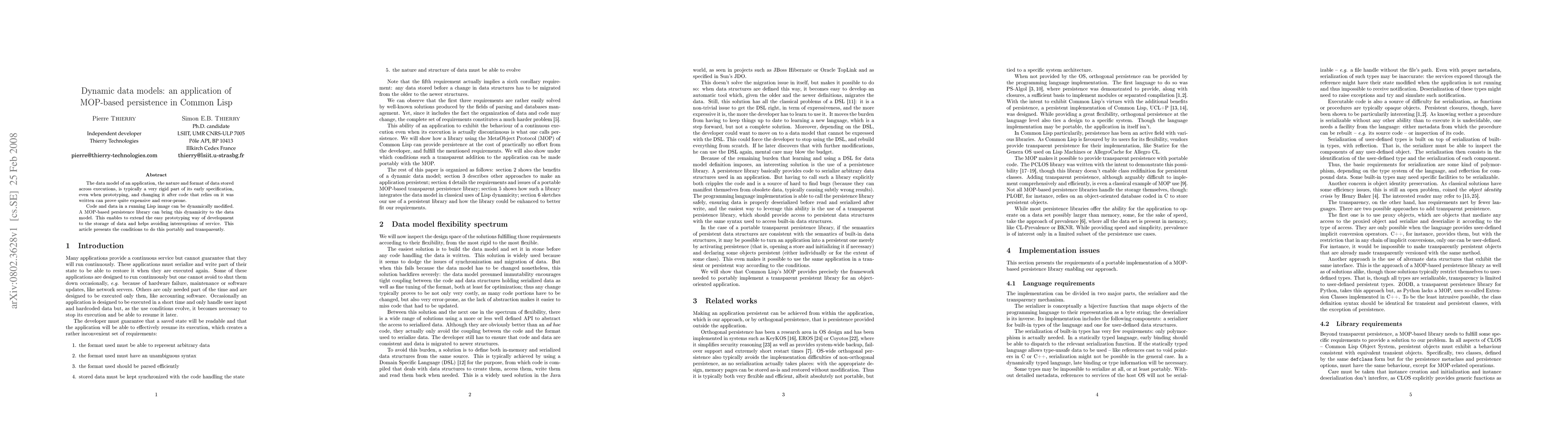 This paper introduces a MOP-based persistence library for Common Lisp, enabling dynamic data model modifications without service interruptions. It discusses conditions for portable and transparent data model changes during application development.