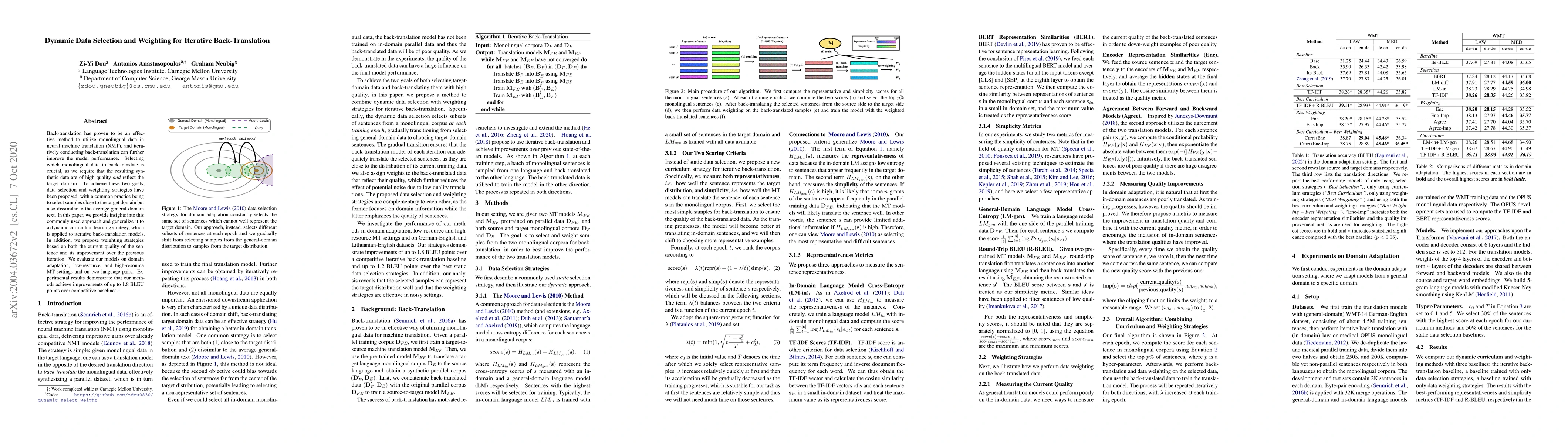 This paper proposes dynamic data selection and weighting strategies for iterative back-translation in neural machine translation, achieving up to 1.8 BLEU point improvements over baselines. The approach selects high-quality, domain-specific synthetic data and employs weighting based on sentence quality and improvement across iterations.