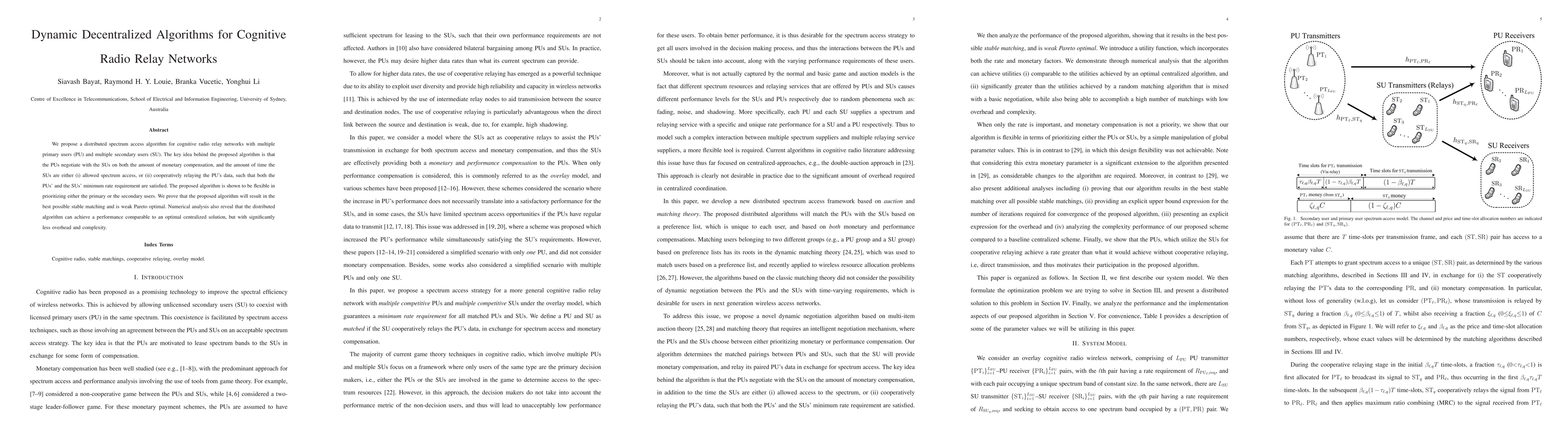 This paper proposes a decentralized algorithm for cognitive radio relay networks that balances primary and secondary users' needs while minimizing overhead and complexity, achieving performance comparable to optimal centralized solutions.