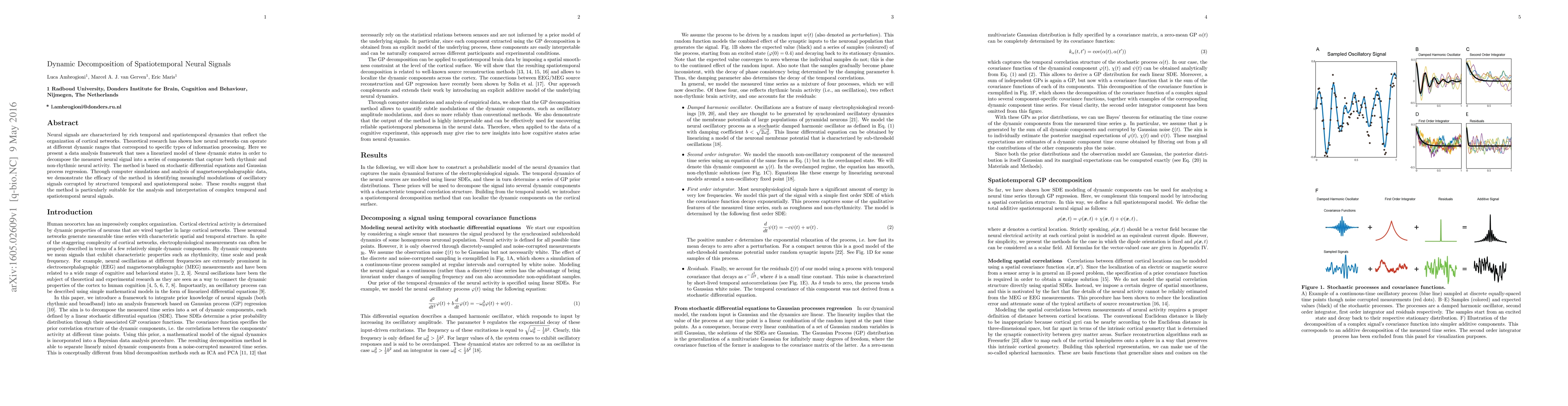 Neural signals are characterized by rich temporal and spatiotemporal dynamics that reflect the organization of cortical networks. Theoretical research has shown how neural networks can operate at different dynamic ranges that correspond to specific types of information processing. Here we present a data analysis framework that uses a linearized model of these dynamic states in order to decompose the measured neural signal into a series of components that capture both rhythmic and non-rhythmic neural activity. The method is based on stochastic differential equations and Gaussian process regression. Through computer simulations and analysis of magnetoencephalographic data, we demonstrate the efficacy of the method in identifying meaningful modulations of oscillatory signals corrupted by structured temporal and spatiotemporal noise. These results suggest that the method is particularly suitable for the analysis and interpretation of complex temporal and spatiotemporal neural signals.