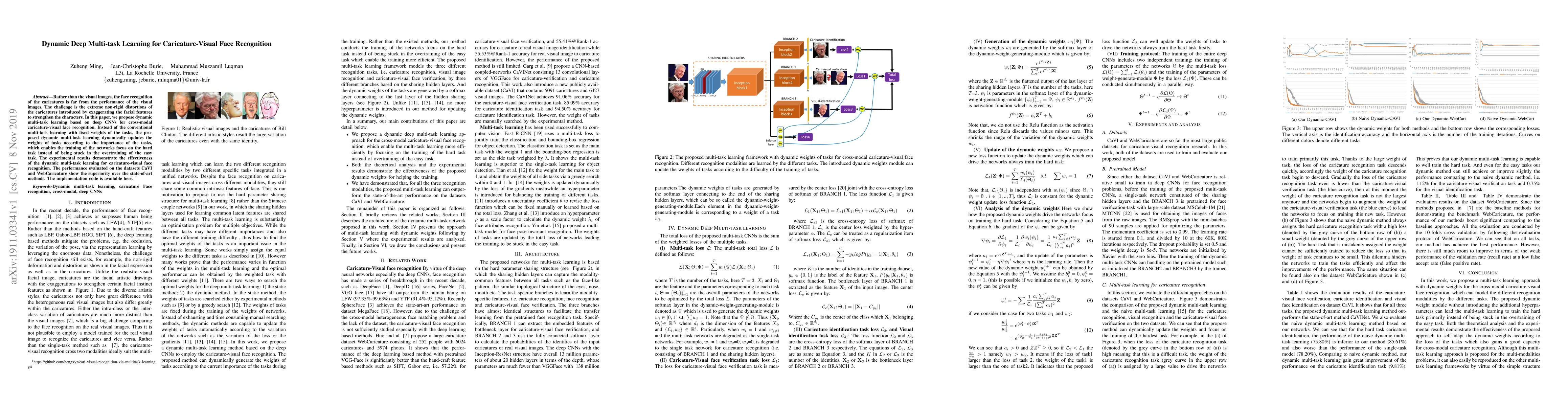 This paper proposes a dynamic deep multi-task learning approach based on CNNs for improved caricature-visual face recognition, addressing the challenge of exaggerated facial distortions in caricatures. The method dynamically adjusts task weights to focus on harder tasks, achieving superior performance over state-of-the-art methods on CaVI and WebCaricature datasets.