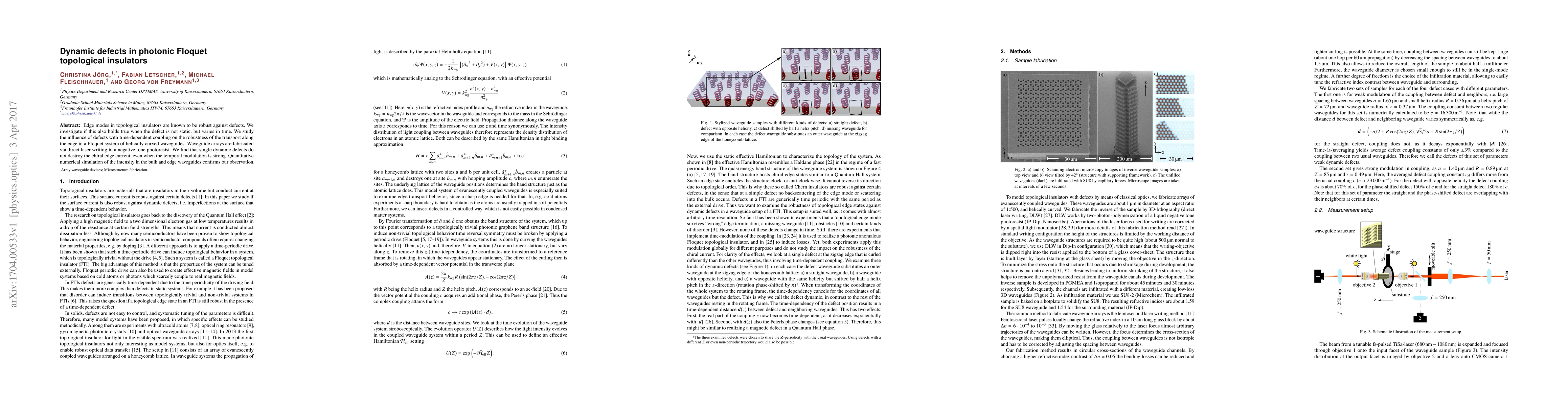Edge modes in topological insulators are known to be robust against defects. We investigate if this also holds true when the defect is not static, but varies in time. We study the influence of defects with time-dependent coupling on the robustness of the transport along the edge in a Floquet system of helically curved waveguides. Waveguide arrays are fabricated via direct laser writing in a negative tone photoresist. We find that single dynamic defects do not destroy the chiral edge current, even when the temporal modulation is strong. Quantitative numerical simulation of the intensity in the bulk and edge waveguides confirms our observation.