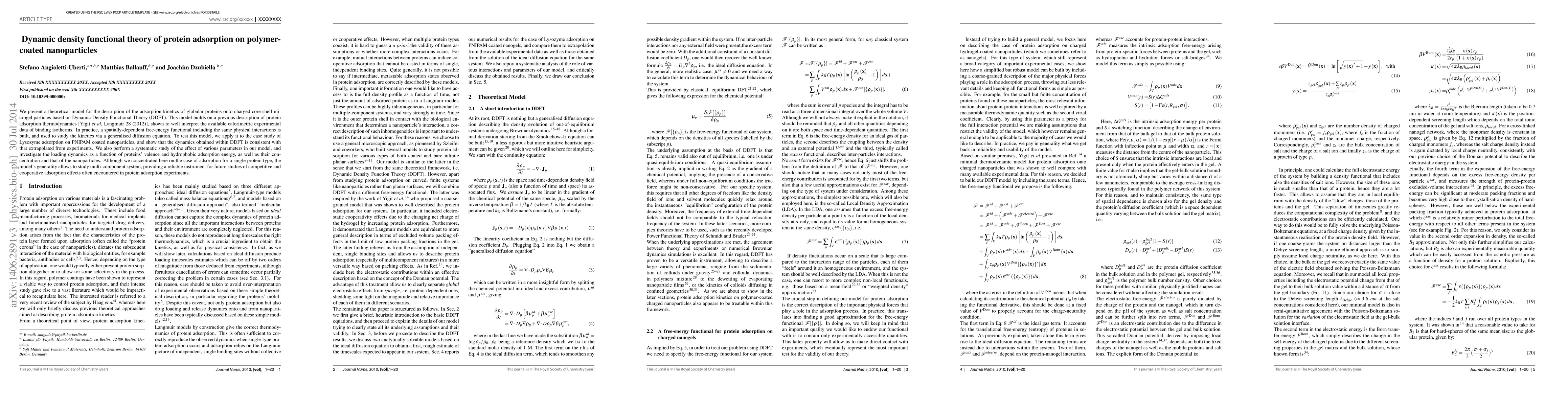 This paper develops a Dynamic Density Functional Theory (DDFT) model to describe the kinetics of globular protein adsorption onto charged polymer-coated nanoparticles, extending previous thermodynamic models. The model's consistency with experimental data for Lysozyme on PNIPAM nanoparticles is demonstrated, and its applicability to multi-component systems is highlighted.