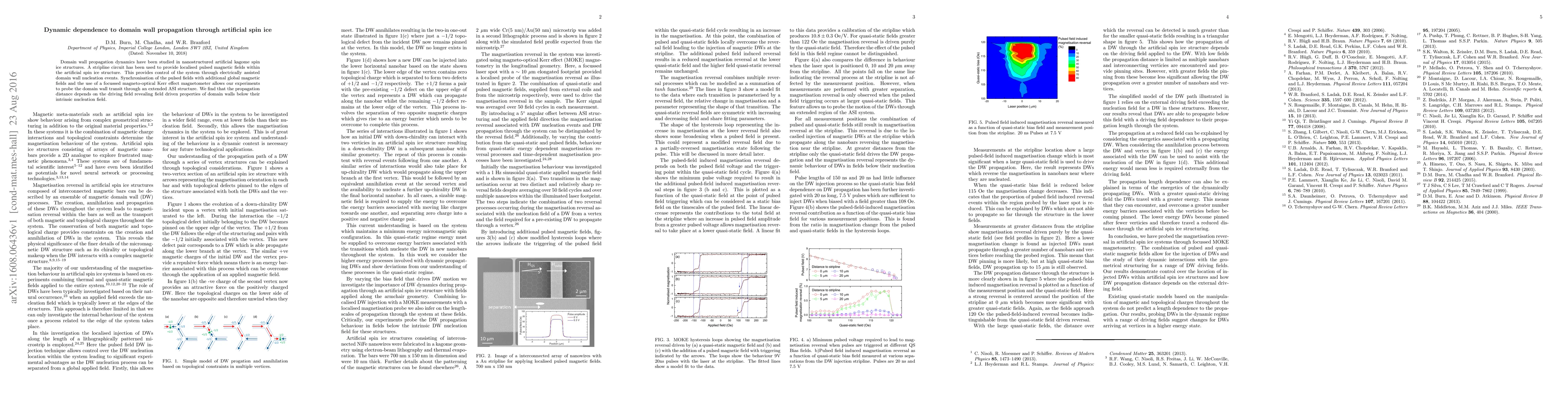 Domain wall propagation dynamics have been studied in nanostructured artificial kagome spin ice structures. A stripline circuit has been used to provide localised pulsed magnetic fields within the artificial spin ice structure. This provides control of the system through electrically assisted domain wall nucleation events. Synchronisation of the pulsed fields with additional global magnetic fields and the use of a focussed magneto-optical Kerr effect magnetometer allows our experiments to probe the domain wall transit through an extended ASI structure. We find that the propagation distance depends on the driving field revealing field driven properties of domain walls below their intrinsic nucleation field.