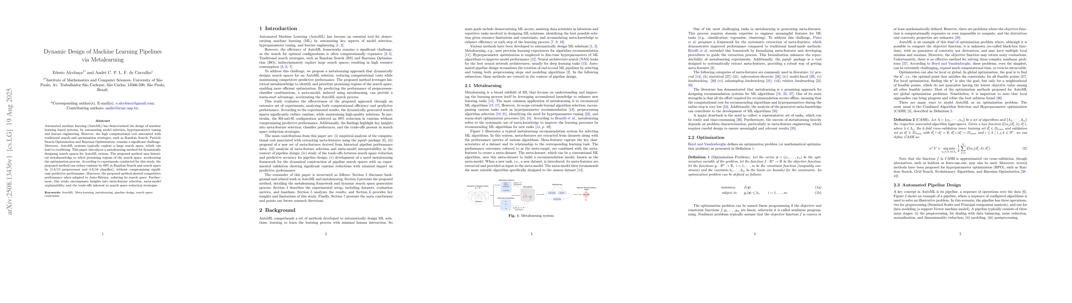 Automated machine learning (AutoML) has democratized the design of machine learning based systems, by automating model selection, hyperparameter tuning and feature engineering. However, the high computational cost associated with traditional search and optimization strategies, such as Random Search, Particle Swarm Optimization and Bayesian Optimization, remains a significant challenge. Moreover, AutoML systems typically explore a large search space, which can lead to overfitting. This paper introduces a metalearning method for dynamically designing search spaces for AutoML system. The proposed method uses historical metaknowledge to select promising regions of the search space, accelerating the optimization process. According to experiments conducted for this study, the proposed method can reduce runtime by 89\% in Random Search and search space by (1.8/13 preprocessor and 4.3/16 classifier), without compromising significant predictive performance. Moreover, the proposed method showed competitive performance when adapted to Auto-Sklearn, reducing its search space. Furthermore, this study encompasses insights into meta-feature selection, meta-model explainability, and the trade-offs inherent in search space reduction strategies.