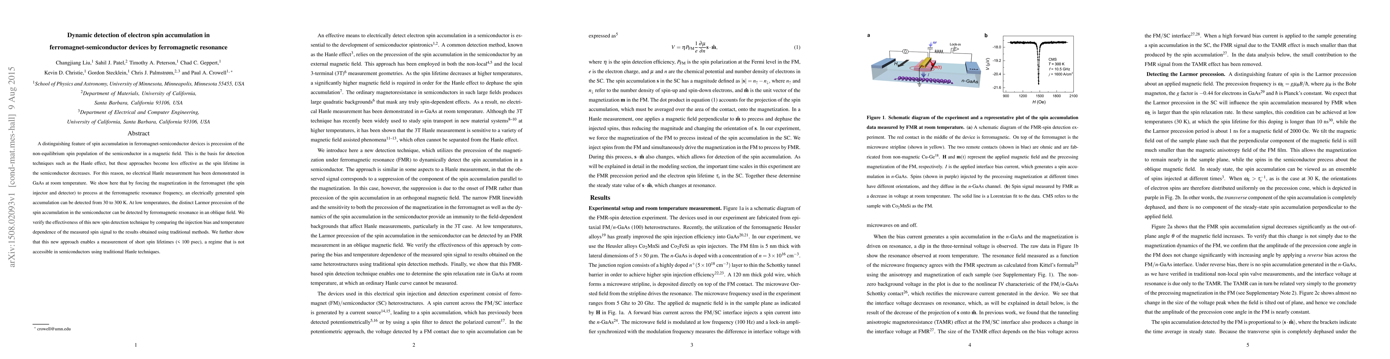 This paper presents a novel method for detecting electron spin accumulation in ferromagnet-semiconductor devices using ferromagnetic resonance at the ferromagnetic resonance frequency, enabling effective measurements from 30 to 300 K and revealing short spin lifetimes (< 100 psec) that traditional Hanle techniques cannot access.