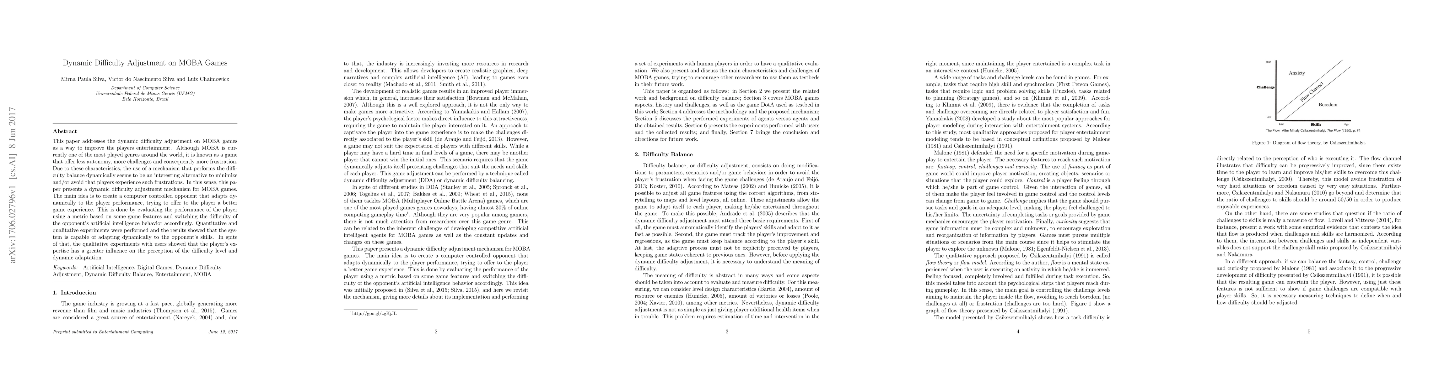 This paper proposes a dynamic difficulty adjustment mechanism for MOBA games to enhance player experience by creating computer-controlled opponents that adapt based on player performance metrics. Experiments indicate the system can adjust difficulty, though player expertise significantly influences perceived difficulty.