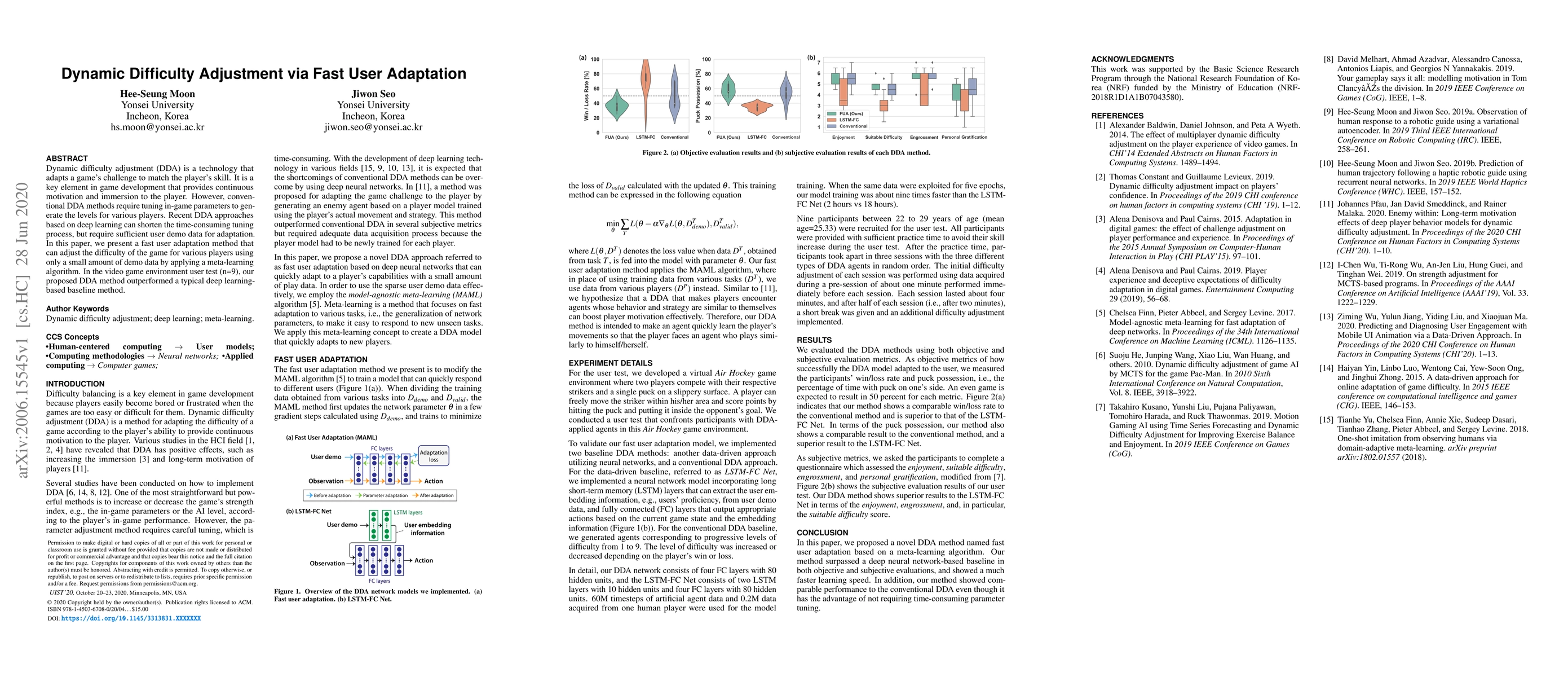 This paper introduces a fast user adaptation method for dynamic difficulty adjustment in games using meta-learning to minimize the need for extensive demo data. The proposed method was shown to outperform traditional deep learning-based baselines in a user test with nine participants.
