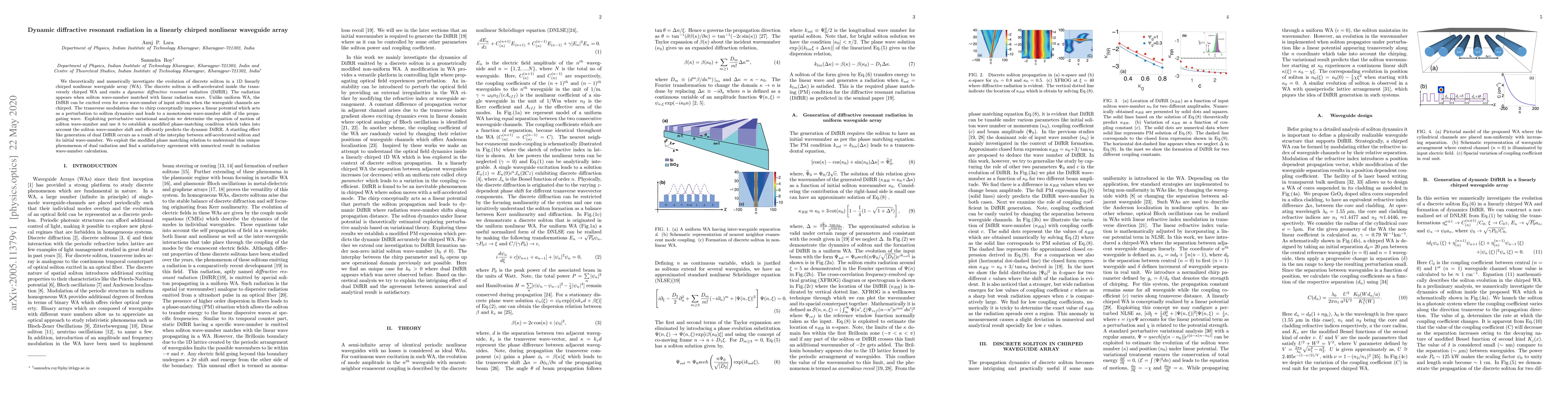 Researchers investigate dynamic diffractive resonant radiation in a linearly chirped nonlinear waveguide array, where a self-accelerating soliton emits radiation with unique properties.