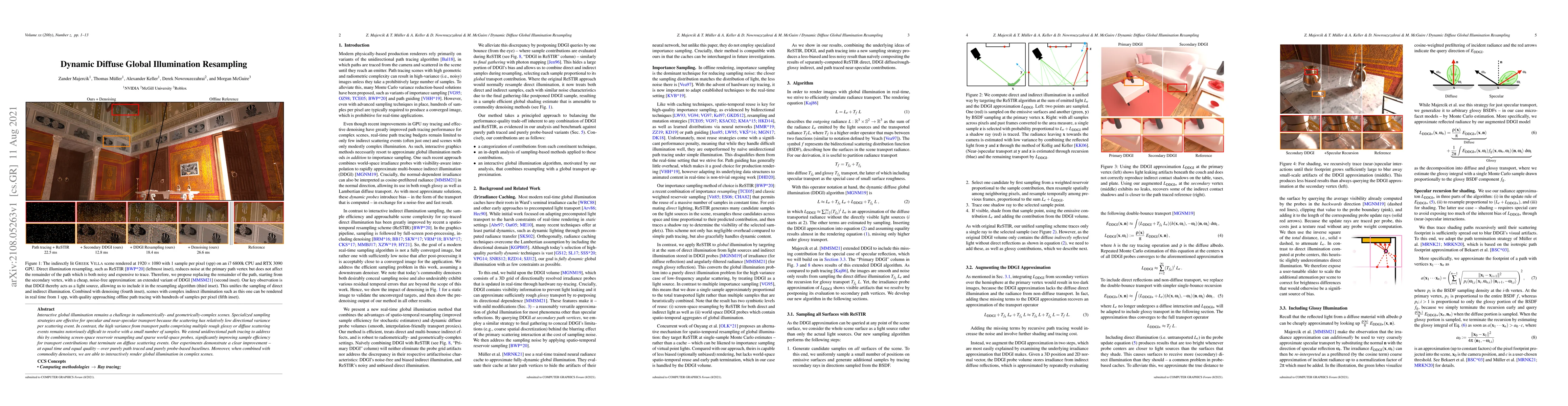 This paper proposes a method combining screen-space resampling and sparse world-space probes to enhance sample efficiency for diffuse global illumination in complex scenes. The approach outperforms traditional path tracing and probe-based methods, enabling interactive rendering of global illumination with the aid of denoisers.