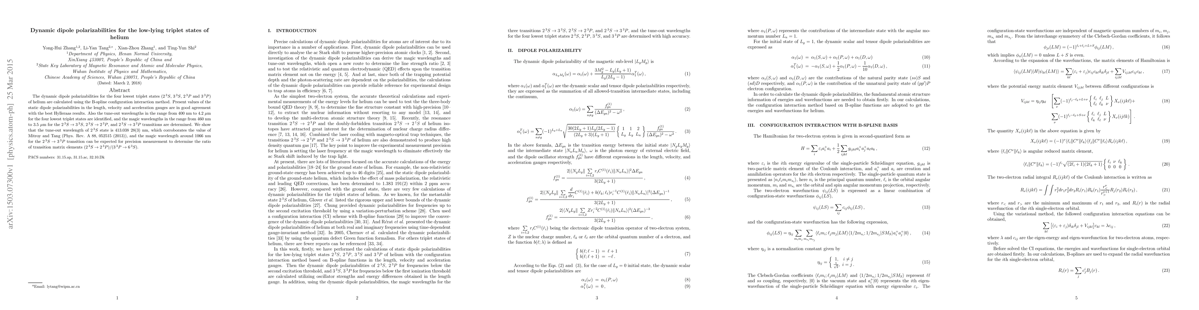 This paper calculates dynamic dipole polarizabilities for helium's four lowest triplet states using the B-spline configuration interaction method, showing good agreement with previous results. It also identifies tune-out and magic wavelengths for these states, including the 413.038 nm tune-out wavelength for the $2\,^3S$ state and a magic wavelength around 1066 nm for the $2\,^3S \to 3\,^3P$ transition.
