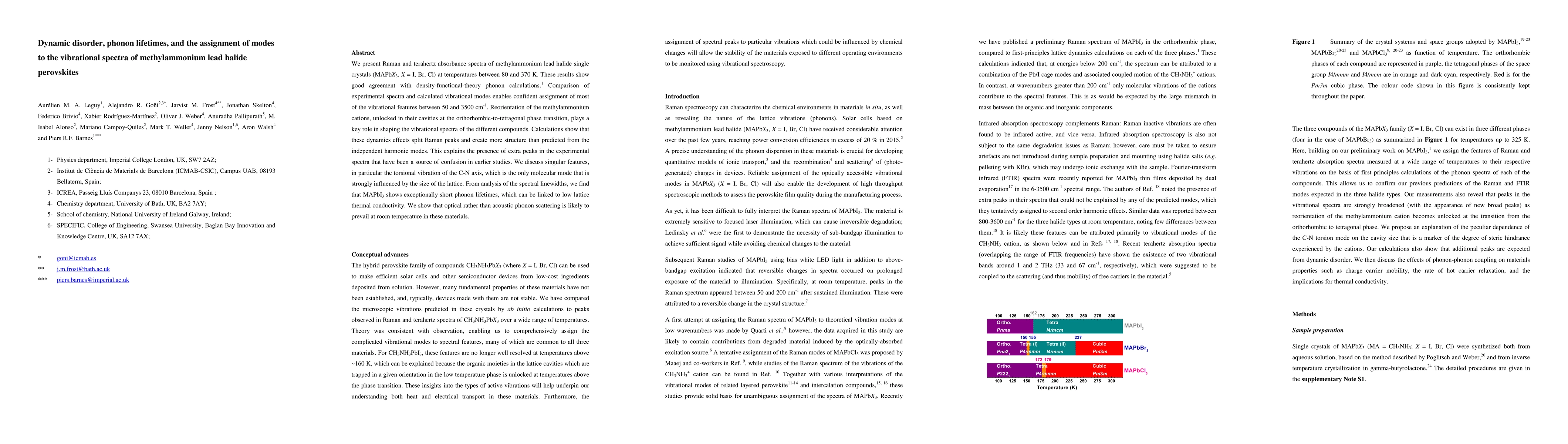 This study investigates the vibrational spectra of methylammonium lead halide perovskites using Raman and terahertz spectroscopy, revealing dynamic disorder effects and assigning vibrational modes. The reorientation of methylammonium cations at phase transitions explains extra spectral peaks, and short phonon lifetimes in MAPbI3 correlate with low lattice thermal conductivity.