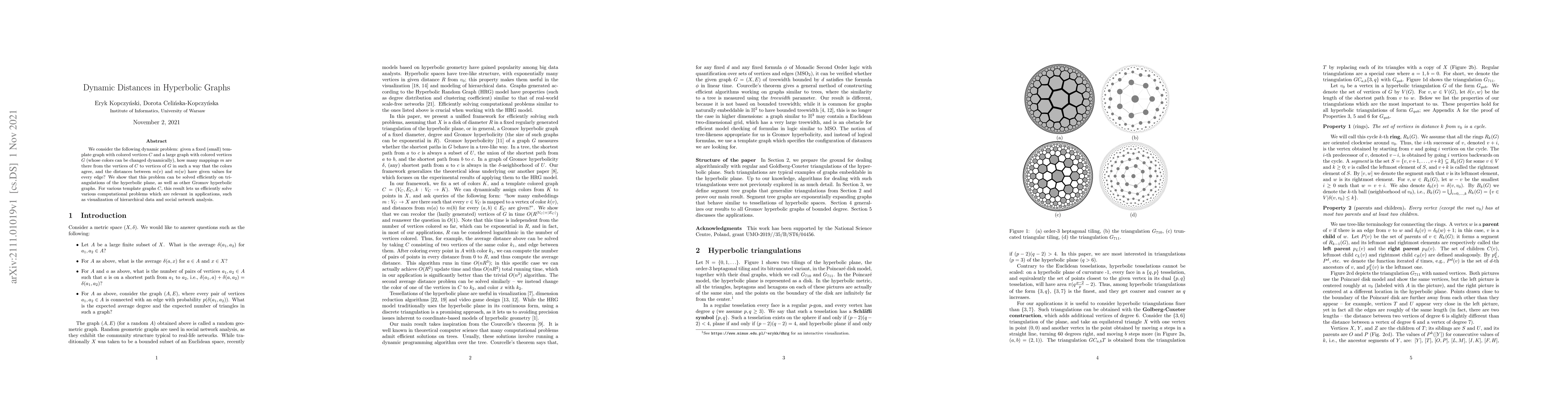 We consider the following dynamic problem: given a fixed (small) template graph with colored vertices C and a large graph with colored vertices G (whose colors can be changed dynamically), how many mappings m are there from the vertices of C to vertices of G in such a way that the colors agree, and the distances between m(v) and m(w) have given values for every edge? We show that this problem can be solved efficiently on triangulations of the hyperbolic plane, as well as other Gromov hyperbolic graphs. For various template graphs C, this result lets us efficiently solve various computational problems which are relevant in applications, such as visualization of hierarchical data and social network analysis.