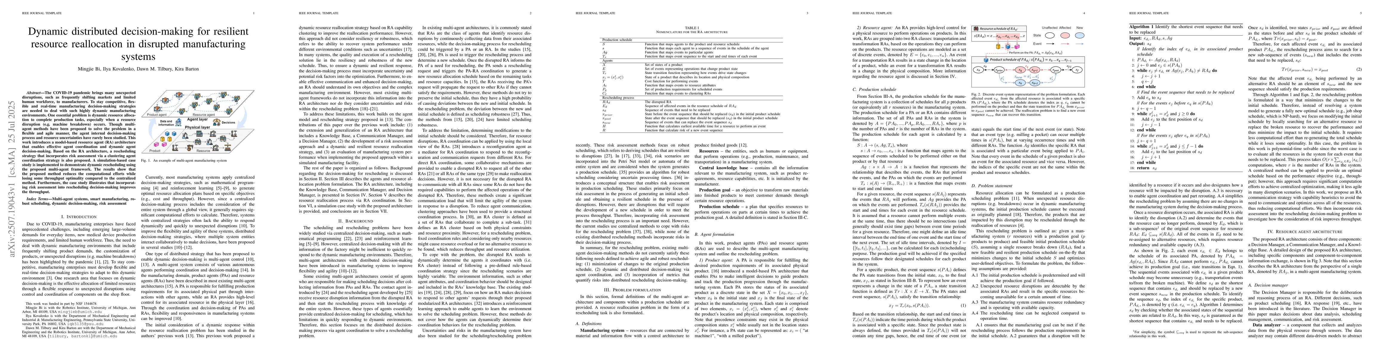 The COVID-19 pandemic brings many unexpected disruptions, such as frequently shifting markets and limited human workforce, to manufacturers. To stay competitive, flexible and real-time manufacturing decision-making strategies are needed to deal with such highly dynamic manufacturing environments. One essential problem is dynamic resource allocation to complete production tasks, especially when a resource disruption (e.g., machine breakdown) occurs. Though multi-agent methods have been proposed to solve the problem in a flexible and agile manner, the agent internal decision-making process and resource uncertainties have rarely been studied. This work introduces a model-based resource agent (RA) architecture that enables effective agent coordination and dynamic agent decision-making. Based on the RA architecture, a rescheduling strategy that incorporates risk assessment via a clustering agent coordination strategy is also proposed. A simulation-based case study is implemented to demonstrate dynamic rescheduling using the proposed multi-agent framework. The results show that the proposed method reduces the computational efforts while losing some throughput optimality compared to the centralized method. Furthermore, the case study illustrates that incorporating risk assessment into rescheduling decision-making improves the throughput.
