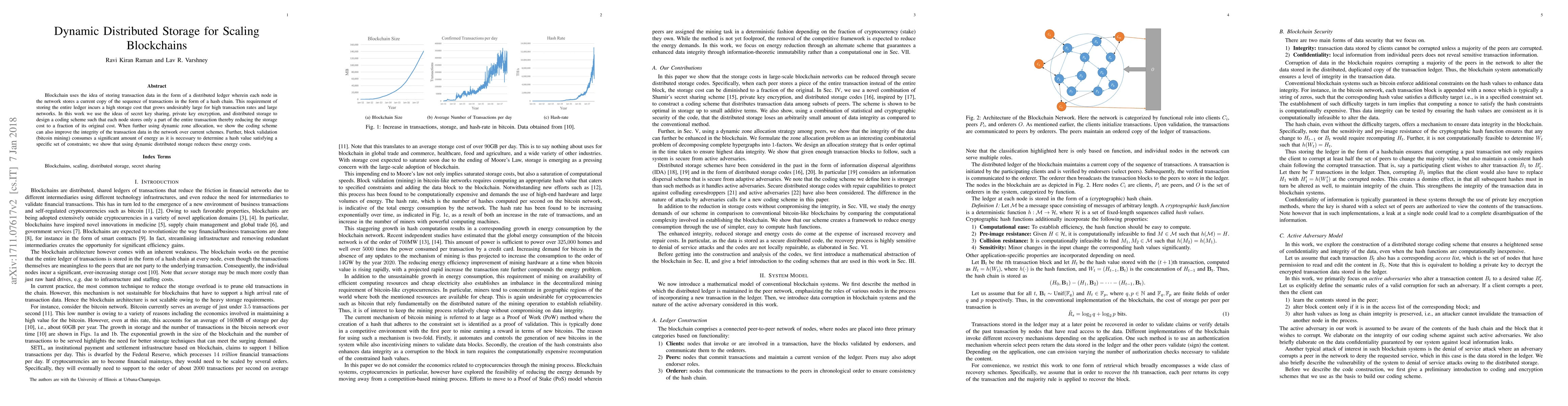 Blockchain uses the idea of storing transaction data in the form of a distributed ledger wherein each node in the network stores a current copy of the sequence of transactions in the form of a hash chain. This requirement of storing the entire ledger incurs a high storage cost that grows undesirably large for high transaction rates and large networks. In this work we use the ideas of secret key sharing, private key encryption, and distributed storage to design a coding scheme such that each node stores only a part of the entire transaction thereby reducing the storage cost to a fraction of its original cost. When further using dynamic zone allocation, we show the coding scheme can also improve the integrity of the transaction data in the network over current schemes. Further, block validation (bitcoin mining) consumes a significant amount of energy as it is necessary to determine a hash value satisfying a specific set of constraints; we show that using dynamic distributed storage reduces these energy costs.