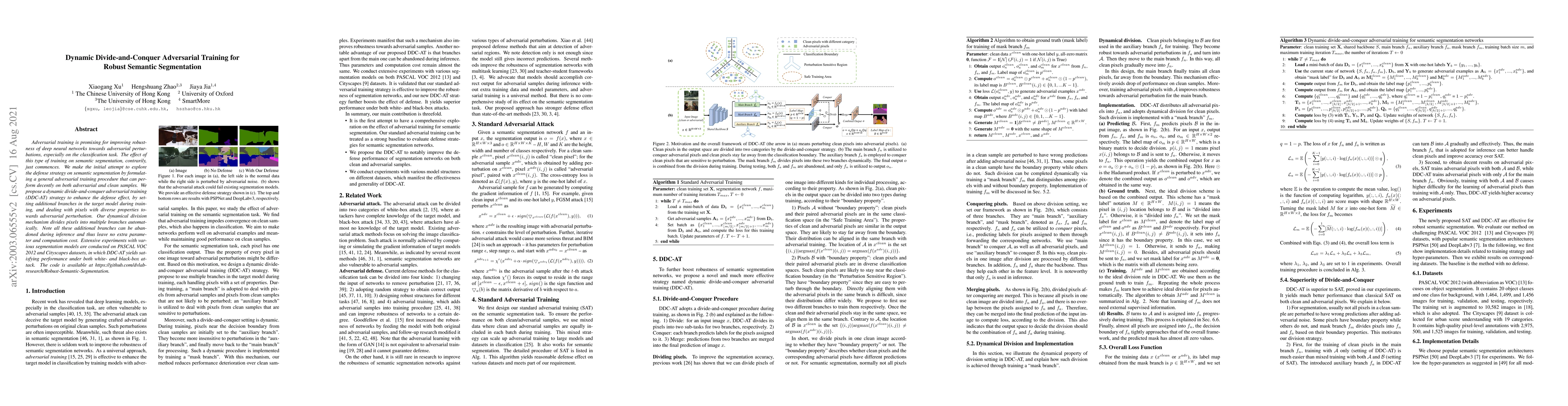 This paper proposes a dynamic divide-and-conquer adversarial training (DDC-AT) strategy to improve the robustness of semantic segmentation models against adversarial attacks. The method introduces additional branches during training to handle pixels with different properties, which are discarded during inference, thus avoiding extra computational costs.